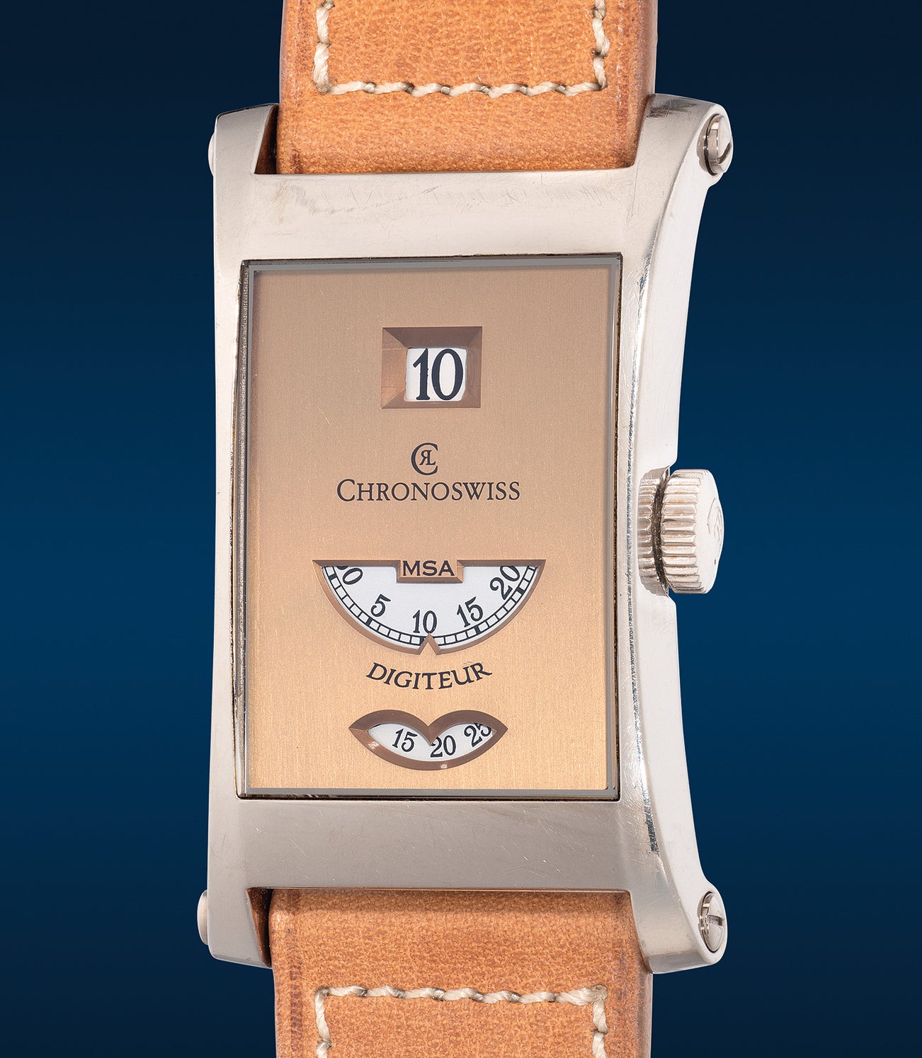 In 2005, Chronoswiss introduced the Digiteur MSA (Montre sans Aiguilles), which translates to "watch without hands" in English. This unique timepiece features a rectangular watch movement based on a NOS (New Old Stock) shaped-movement from FEF. FEF, founded by Jules Jéquier and David Louis Petitpierre in Fleurier, Val de Travers, Switzerland, in 1882, specialized in producing movement blanks. In 1920, their movement-blank division gained independence under the name "Fabrique d'ébauches de Fleurier (FEF)."