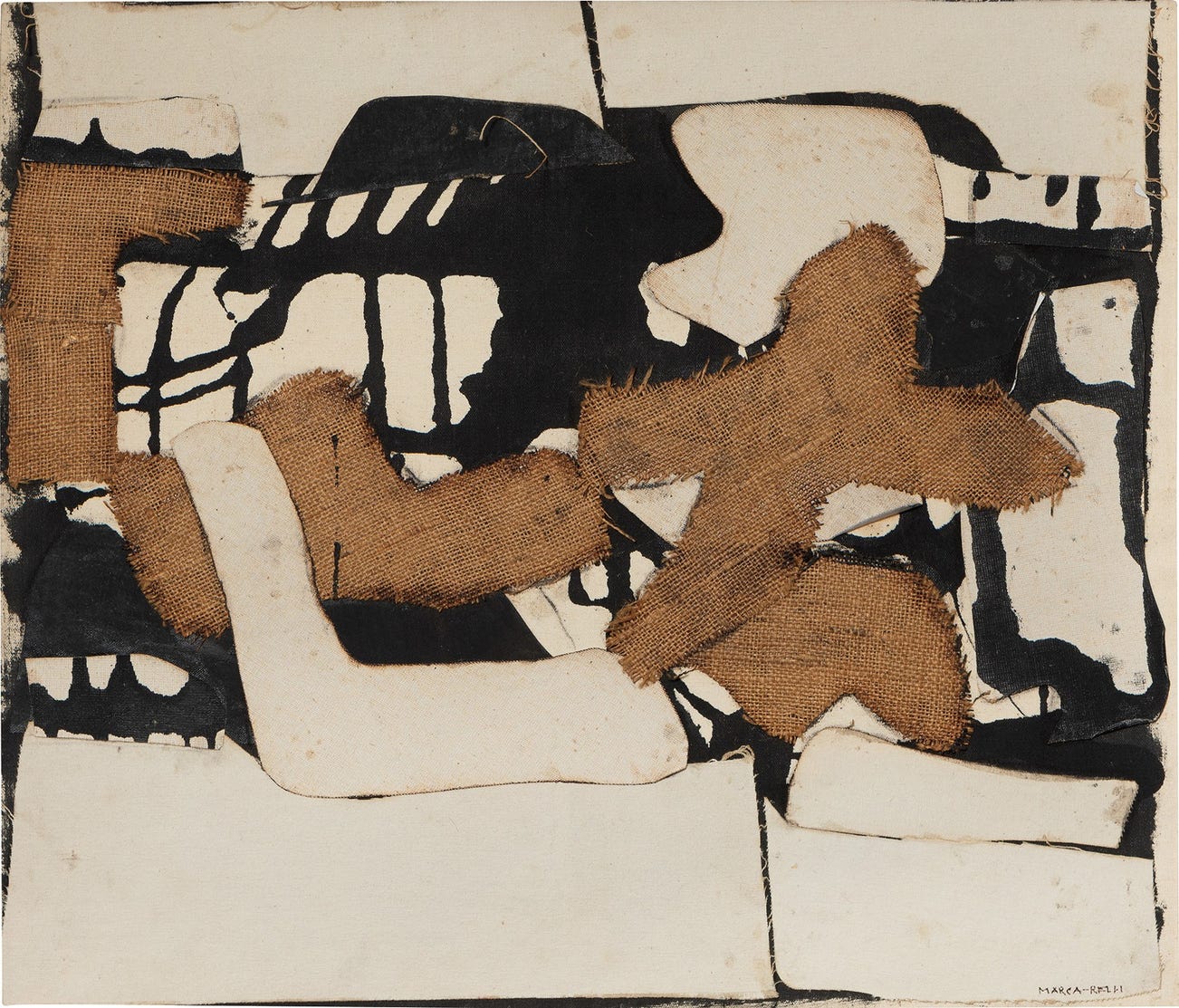 ink on jute and canvas collage on canvas laid on panel