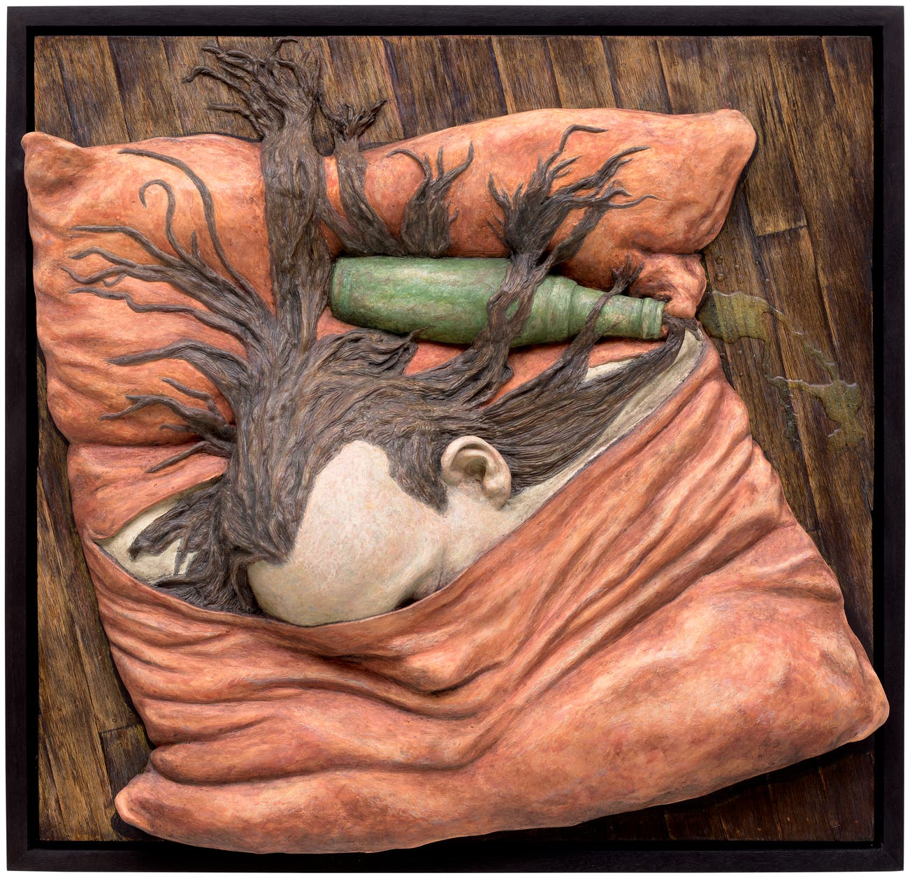 wood, plaster, pigmented joint compound, epoxy putty, milk paint, wax, graphite, coloured pencil and epoxy resin, in artist's frame
