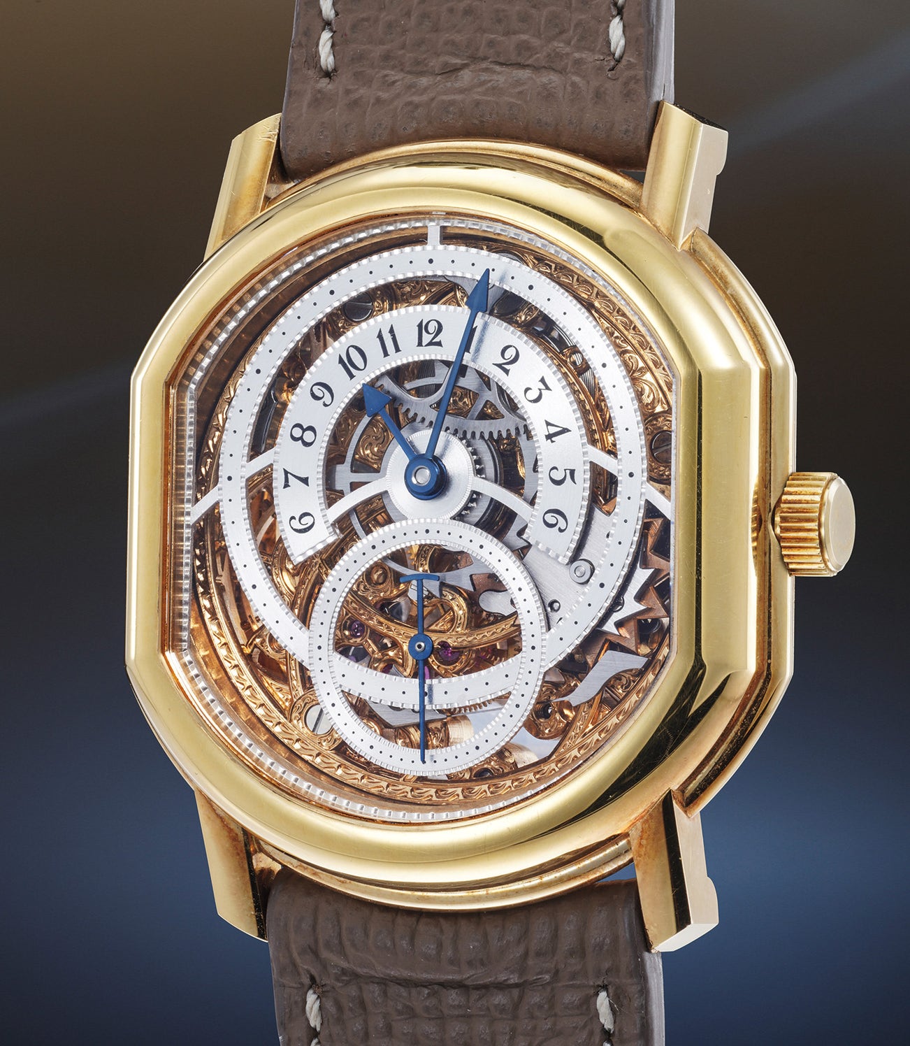 This example however elevates the horological appeal and aesthetic impact of the watch as we are in the presence of the extremely rare reference C127S (for Squelette - skeletonized). The openworked dial allows the wearer to admire the jump hour mechanism in action, with the driving wheel at 4 o’clock interlocking with the hour wheel and activated by a lever connected to the minute wheel - all perfectly visible. The attention to detail present in the movement is awe-inspiring. Said to be inspired by a George Daniels pocket watch, the dial features a flawless circular satin finish and engine-turning of the outer edges, a procedure as difficult to perform on such minute pieces of metal as it is subtly eye-pleasing in its final result.