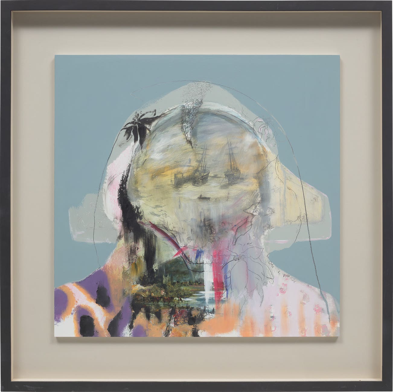oil, acrylic, graphite and paper collage on board, in artist's frame
