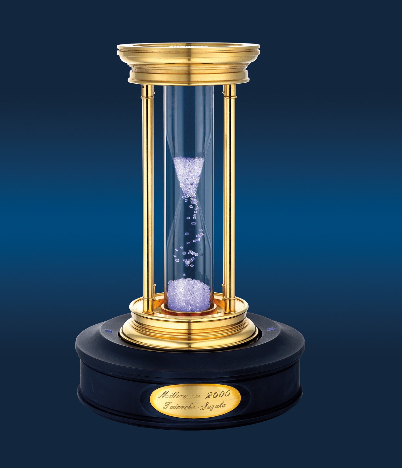 Founded in 1888 by Cecil Rhodes, De Beers have been the leaders in the field of mining and the trading of rough diamonds as well as high jewellery over the past century. As a member of the sightholder, the firm was responsible of supplying over 80% of the world’s rough diamond distribution until the start of the 21st century. With that said, De Beers have been continuously growing their brand as one of the top jewelers in the world offering the finest diamond-set jewellery to the world’s elites. To commemorate the new millennium, De Beers made a limited edition series of diamond-filled Hour Glass timers as gifts to their most loyal clients around the globe and for the Japanese market. The present example features a beautiful gold plated frame encapsulating 2,000 diamonds that fall effortlessly within the Hour Glass. Accompanied by an illuminated stand with its original fitted presentation box this is a delightful hourglass to be admire in the studies or office of any collector.