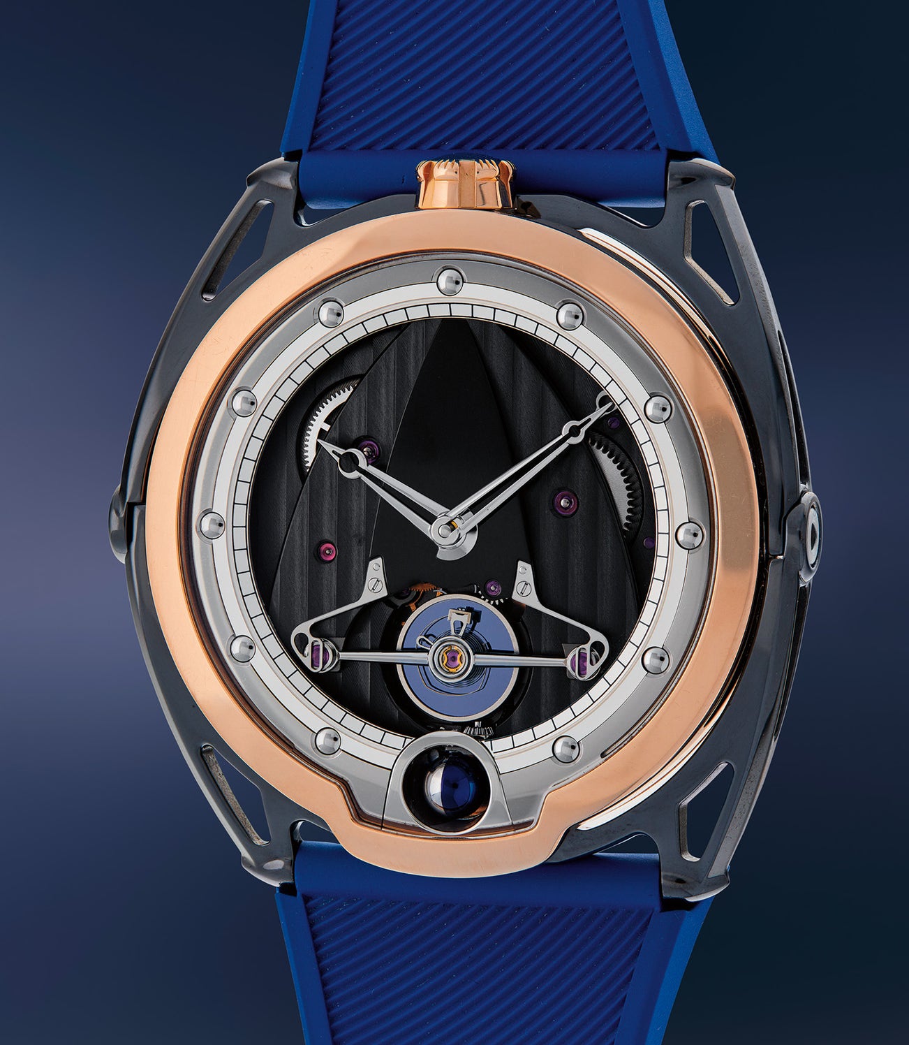 The DB28 was presented to the public in 2011 and was awarded the highest distinction award, the “Aiguille d’Or”, at the GPHG 2011 for its very first iteration in titanium. Achieving such a feat, the DB28 is perhaps a perfect example of the firm’s approach to watchmaking. The design is modern yet has a futuristic approach that could be considered more 22nd century, than 21st. There is no traditional dial, instead the movement’s ruthenium-plated top plate decorated with Geneva striping is visible, along with the balance wheel, innovative shock absorber, and portions of the mainspring barrels. Another De Bethune signature element is the 3D moonphase rotating at 6 o’clock, while a wind performance indicator is placed discreetly between 2 and 3 o’clock. A 6-day power reserve indicator is incorporated on the back. The movement features a cavalcade of elements that have been developed or patented by De Bethune making it truly unique and like no other, including a self-regulating twin barrel, a titanium balance wheel with white gold insets, a “De Bethune” hairspring with flat terminal curve, silicon escape wheel and a triple pare-chute shock absorbing system. This cutting-edge technology is nevertheless merged with the brand’s superlative hand finished components. The innovative case design, lugs made of zirconium and pink gold, features flexible lugs that elegantly conform to the wrist.