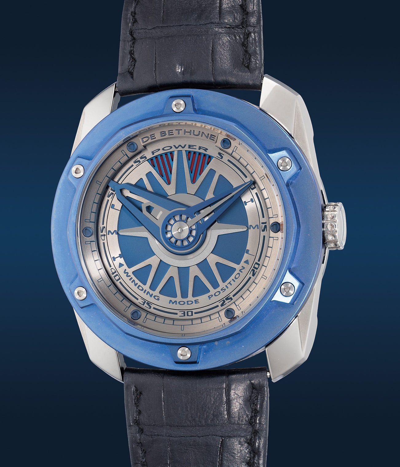 Cased in two tone titanium with a blued titanium bezel and a mirror-polished and satin-finished main body, the present example features unique special details such as its blued components, including dial, hands, screws and bezel, differing to other examples of the reference as a special request. Well-preserved and accompanied by the Certificate of Origin provided by De Bethune. The present DB24 will surely ignite interest from collectors of this hot and popular independent firm.