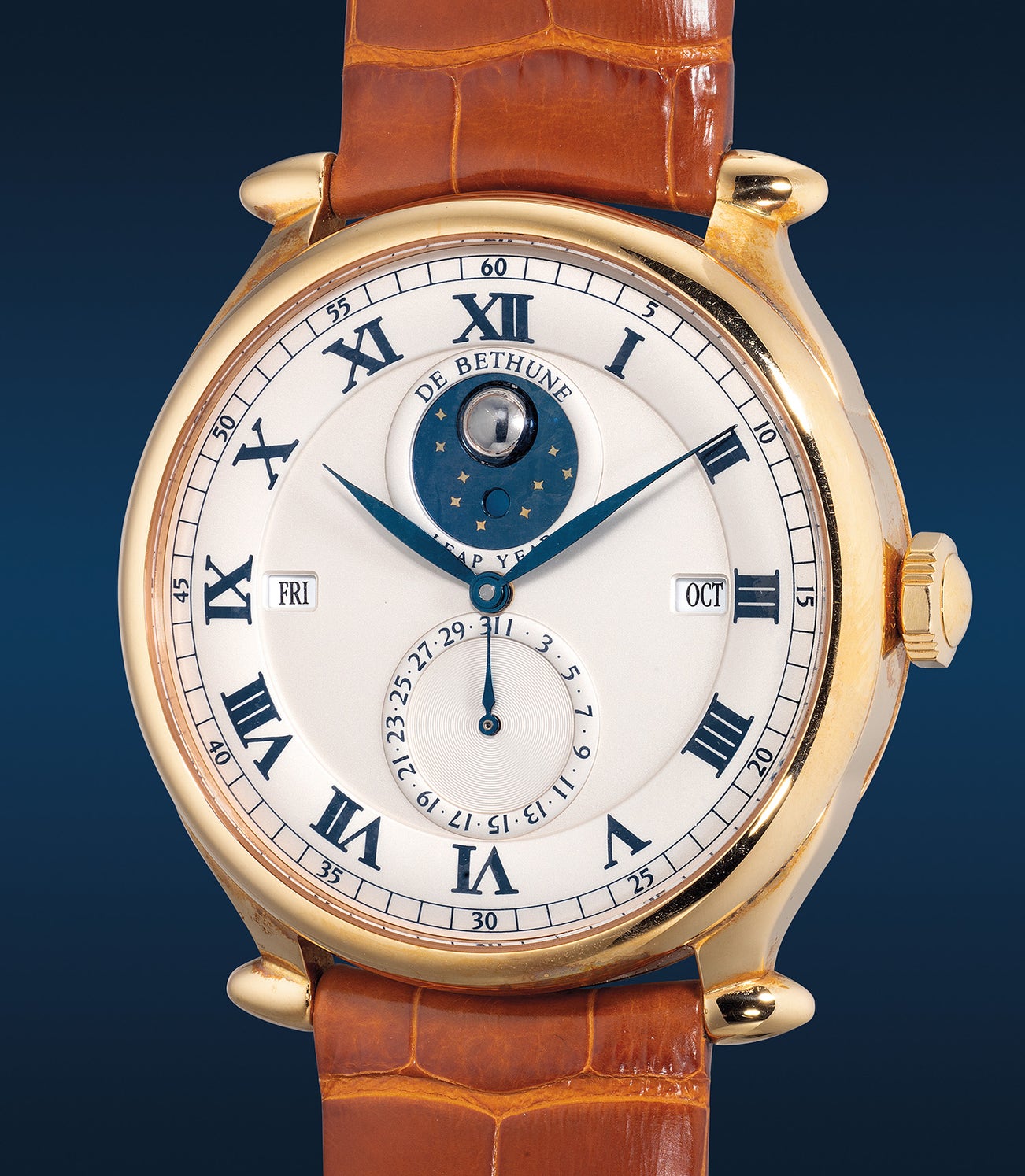 According to research, three metals were available for the model: white gold, platinum and pink gold like the present example. To our knowledge only 44 pieces of the DB15RT were made since 2004. Belonging to one of the early creations from De Bethune recongized by the cone-shaped lugs, the timepiece is sized at 43.4mm diameter. The perpetual calendar mechanism powered by the caliber DB2004 was also the first to be produced entirely at the manufacture and is equipped with the world-first function of rapid date adjustment by and intermediate position of the winding crown. The leap year indication is indicated by the aperture below the spherical moon phase amongst the starry sky.