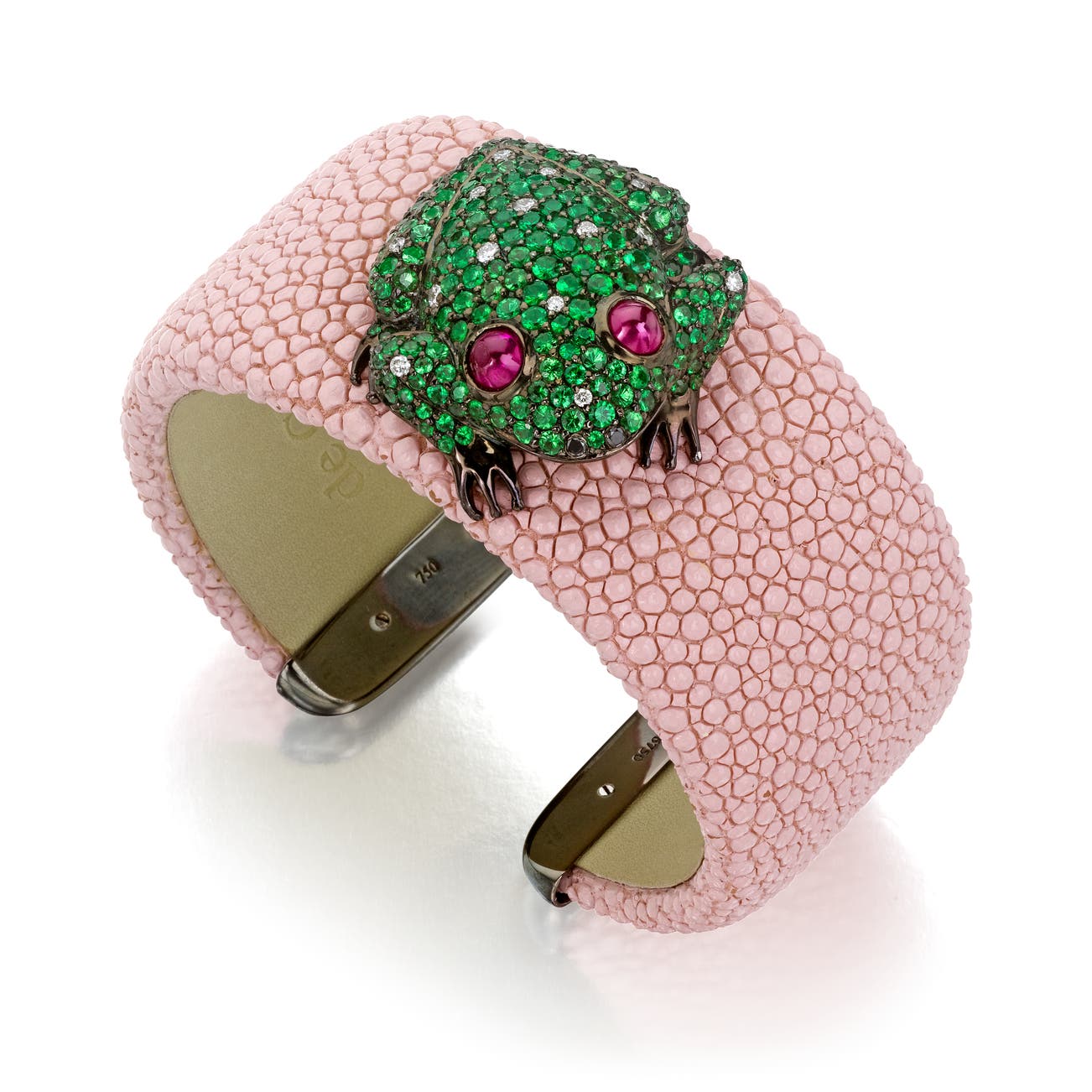 A perched frog set with circular-cut tsavorite garnets and brilliant-cut diamonds, accented by cabochon ruby eyes, on stingray leather, with 18k blackened gold, inner circumference approximately 5 1/2 inches, signed de Grisogono, with maker's mark for de Grisogono.