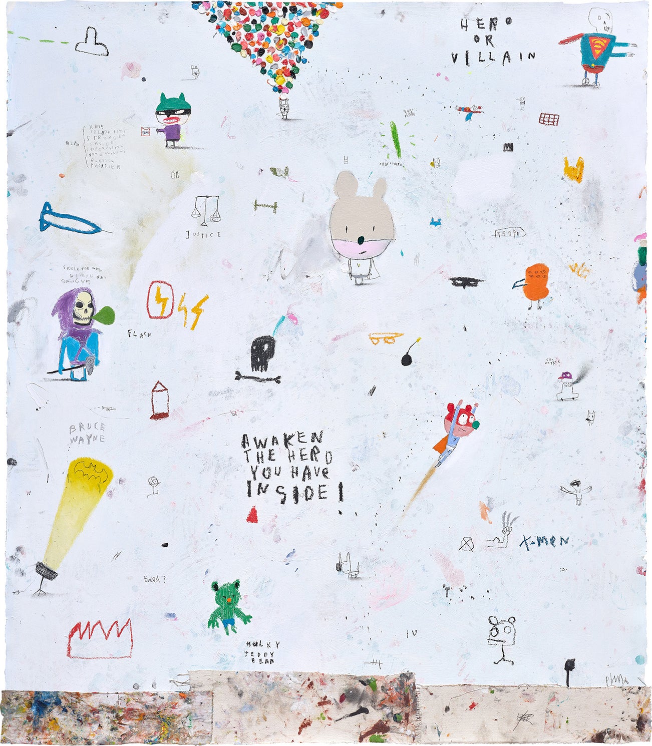 款識:Plans(右下);《HERO OR VILLAIN》(右上)
