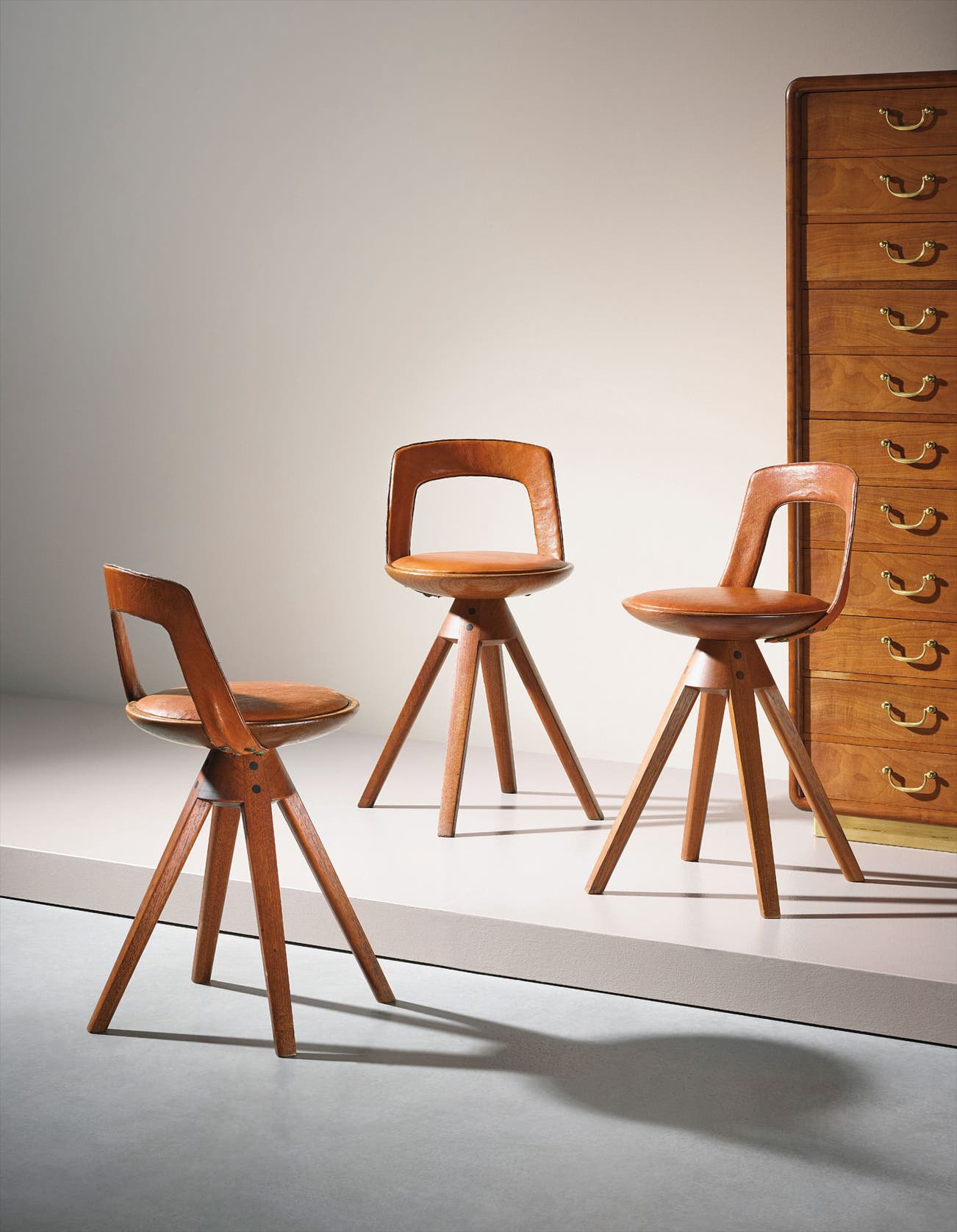 The present model was exhibited at the 'Copenhagen Cabinetmakers’ Guild', Kunstindustrimuseet, Copenhagen, 20 September-6 October 1957, stand 7. The stool attracted a great deal of attention during the exhibition, notably that of Queen Ingrid of Denmark, who was so impressed by its design that she decided to purchase a stool for her own rooms.