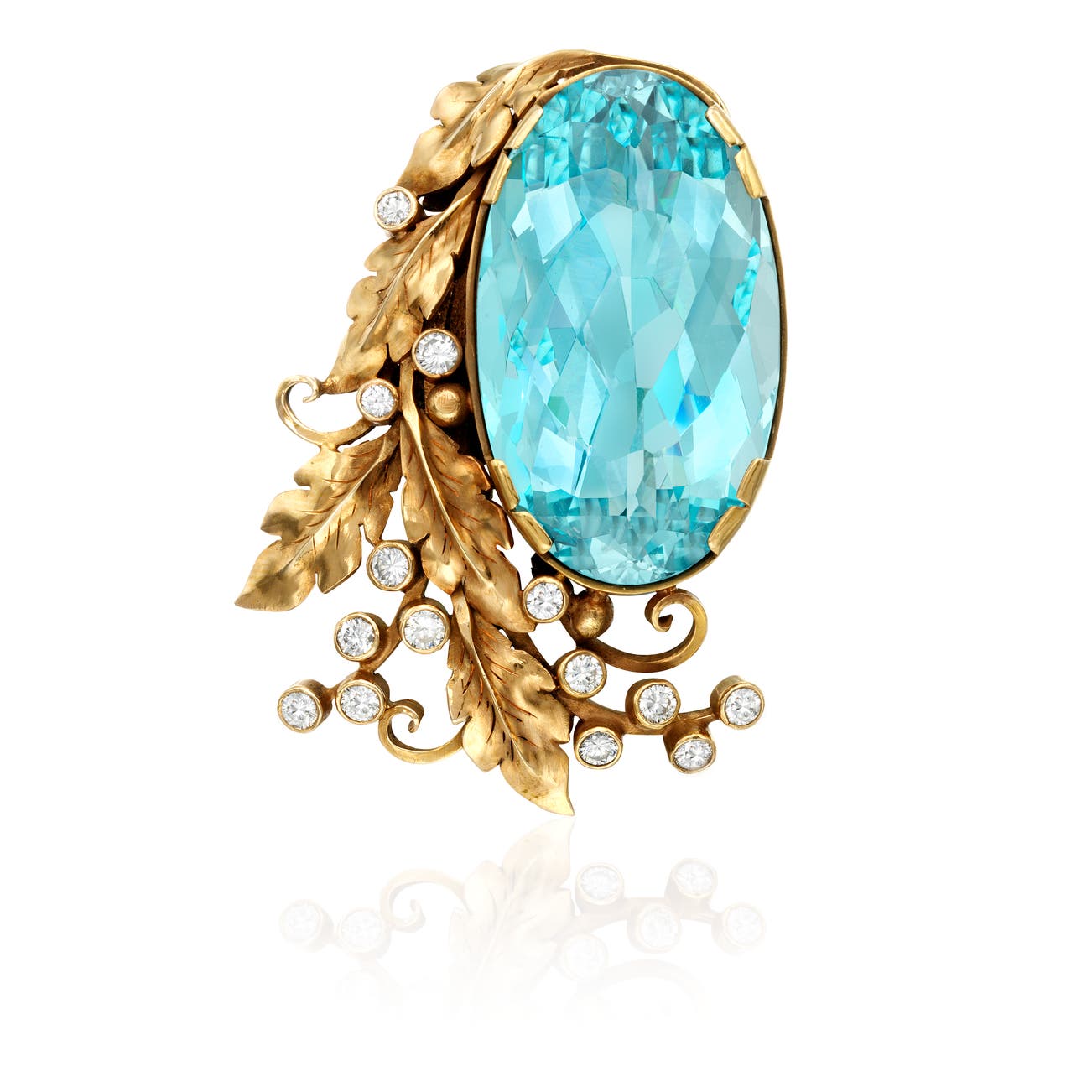 Of foliate design, set with a a mixed-cut oval aquamarine measuring approximately 37.00 x 21.85 x 13.70mm, decorated with brilliant-cut diamonds, mounted in 14k yellow gold, measuring approximately 2 1/8 x 1 1/2 inches, with maker's mark for Edward Oakes.
