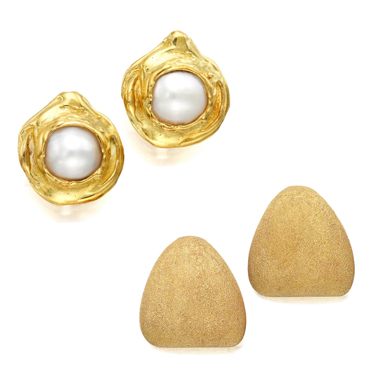 One pair of earrings in 18k yellow gold, measuring approximately 1 inch, signed Henry Dunay, and one pair of ear clips set with pearls, mounted in 18k yellow gold, measuring approximately 1 1/8 inches, signed Gage, with British assay marks.
