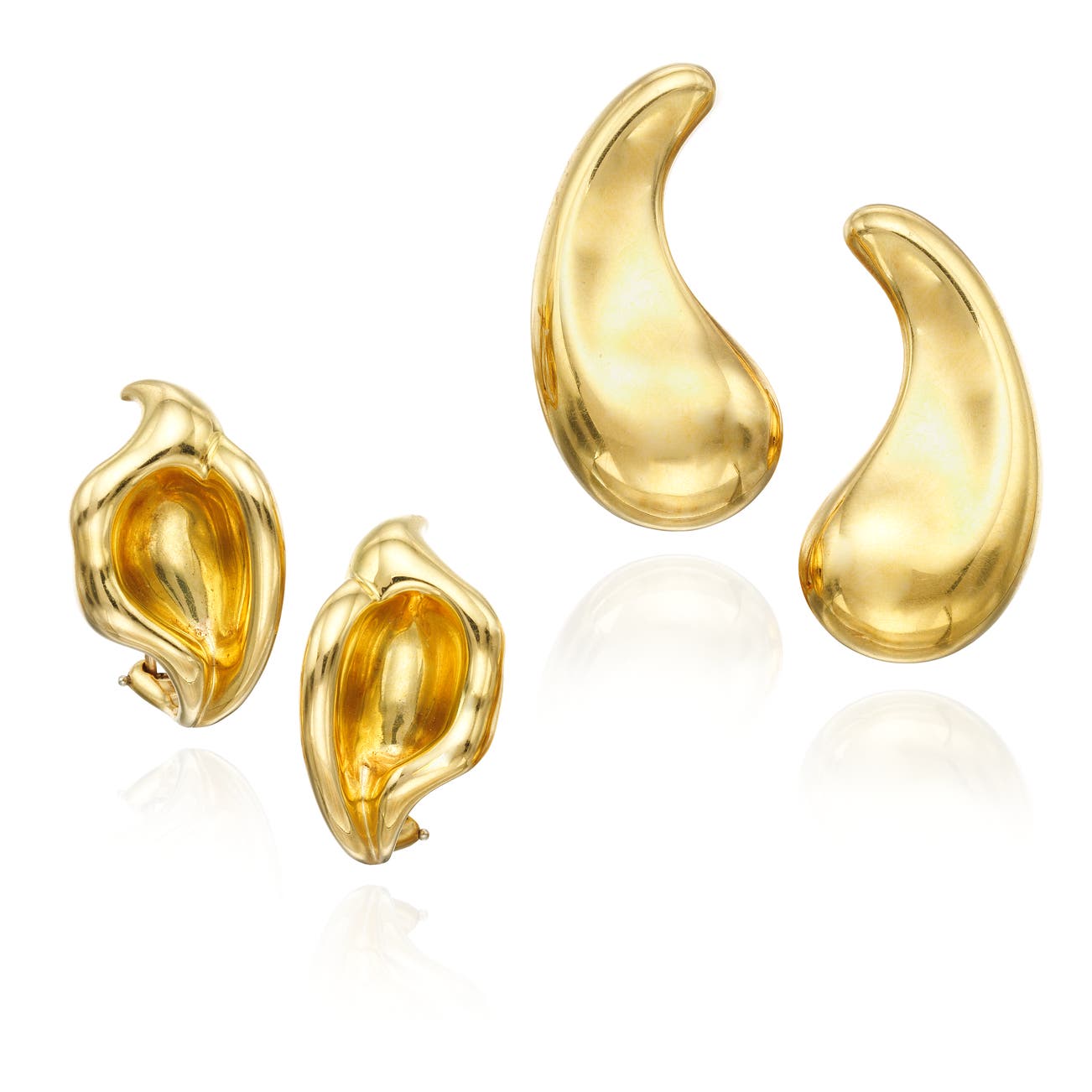 A pair of earrings designed as calla lilies, in 18k yellow gold, measuring approximately 1 1/8 inches, signed Tiffany & Co. Peretti, and a pair of ear clips designed as teardrops, in 18k yellow gold, measuring approximately 1 1/2 inches, signed Tiffany & Co. Peretti.