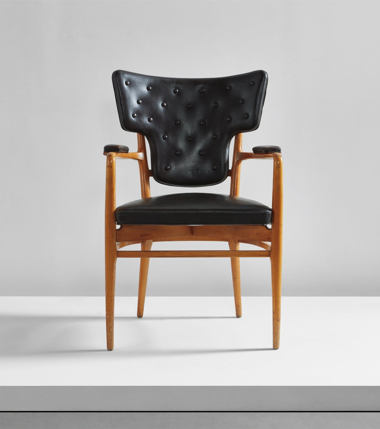 When he designed the Göteborg Law Courts in the mid-1930s, Erik Gunnar Asplund paneled the walls of the kidney-shaped courtrooms in pine, creating a contrast of vertical lines and organic curves. Asplund carried the dynamic aesthetic into the furniture he designed for the Law Courts as well, such as the present wood and leather armchair, which was placed behind the arched stand in one of the courtrooms.