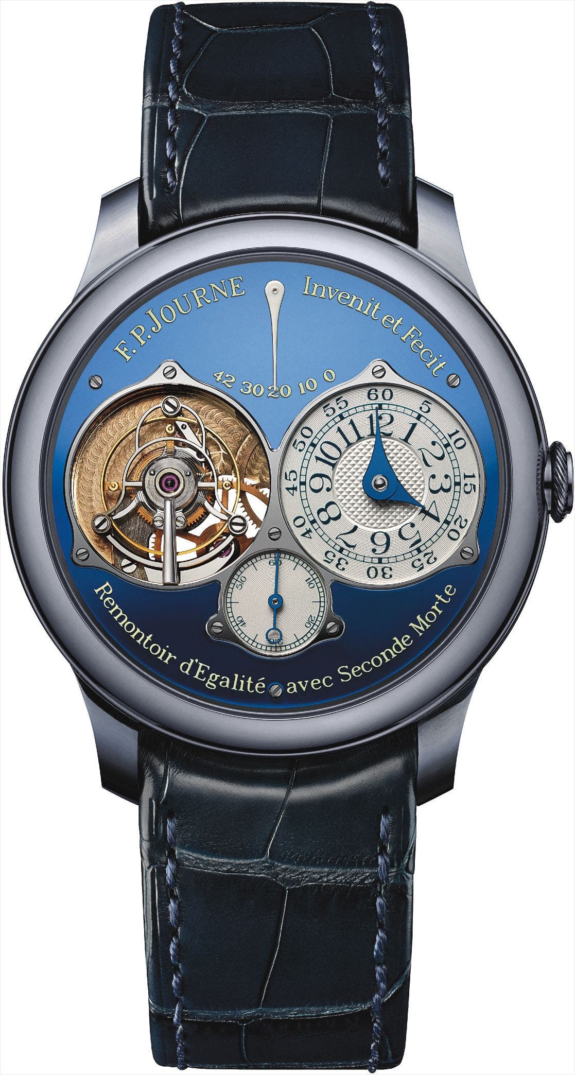 The very astonishing blue chrome dial reflects like a mirror and its color changes according to light. Its F.P.Journe movement in 18K rose Gold features the renowned remontoire (constant force device) and the dead beat second.