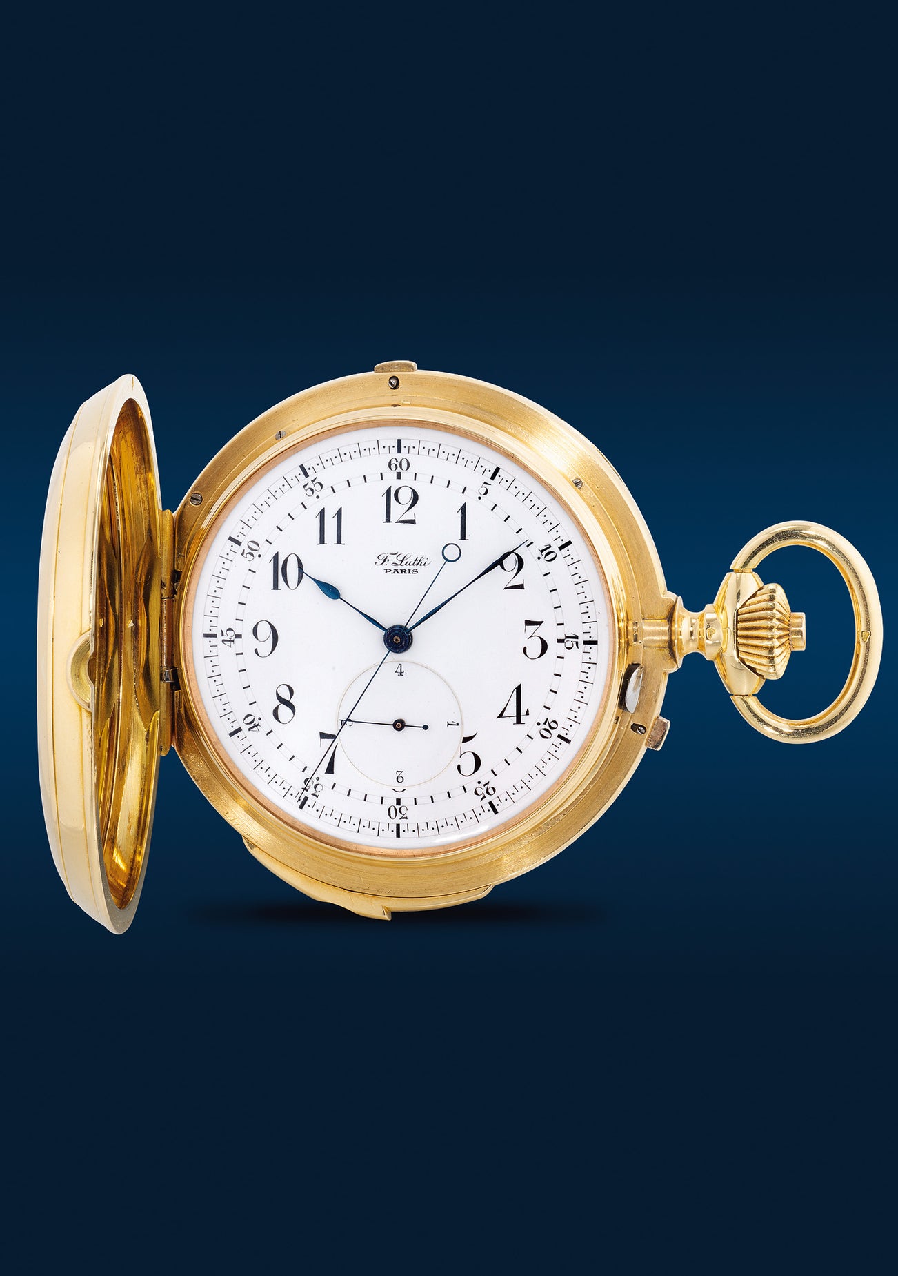 F. Luthi,十分精細罕有,黃金三問懷錶,備琺瑯錶盤、獨立跳秒及四分一閃電跳秒顯示,約1900年代製。