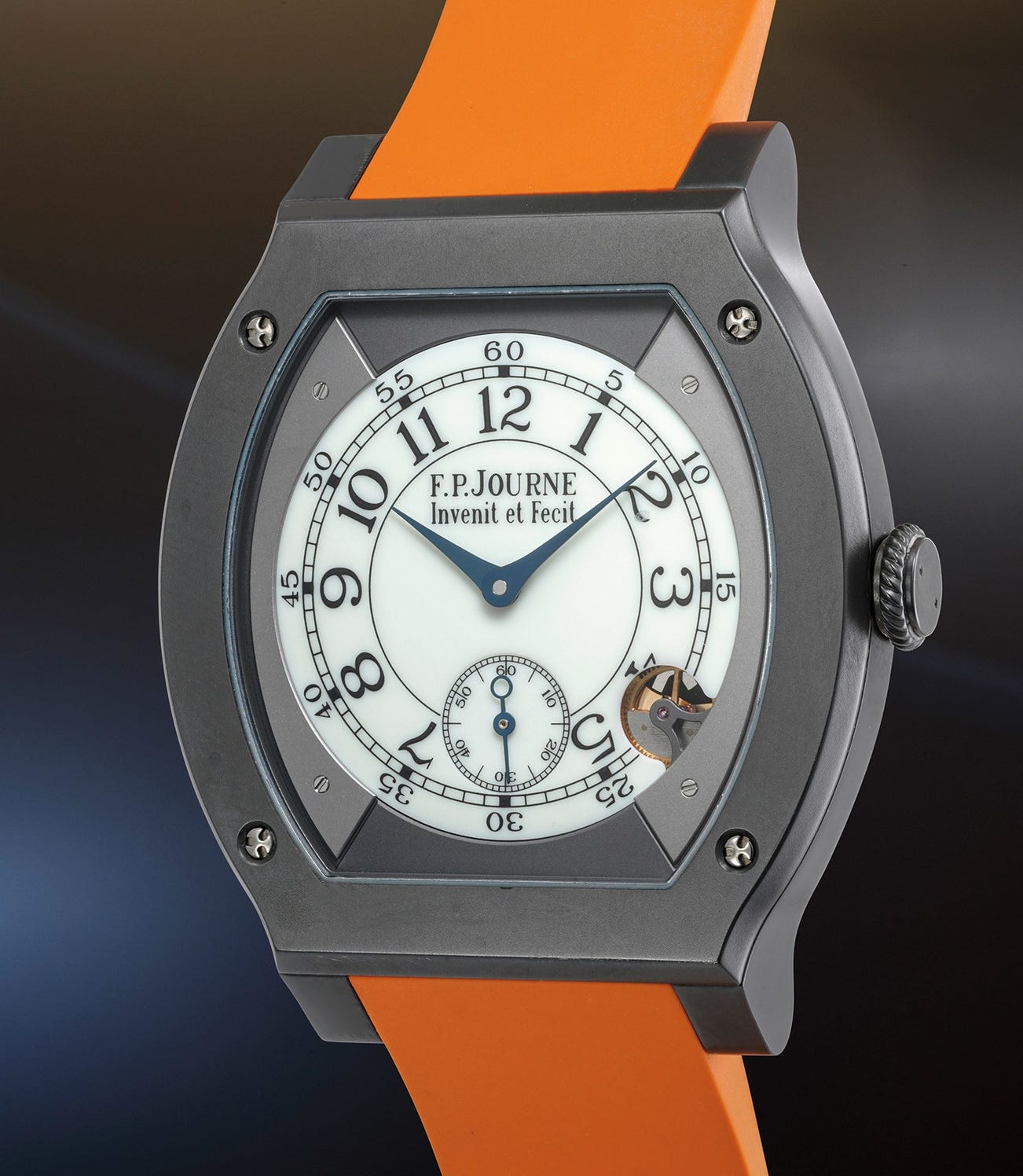 The present Élégante sized at 48mm Titalyt case is paired with an orange rubber strap giving the watch a very sporty yet elegant and sophisticated look. Offered in excellent overall condition and accompanied with its accessories, the Élégante is certainly one of the most sought after independent timepiece with its superb technical innovation and classical tortue case.