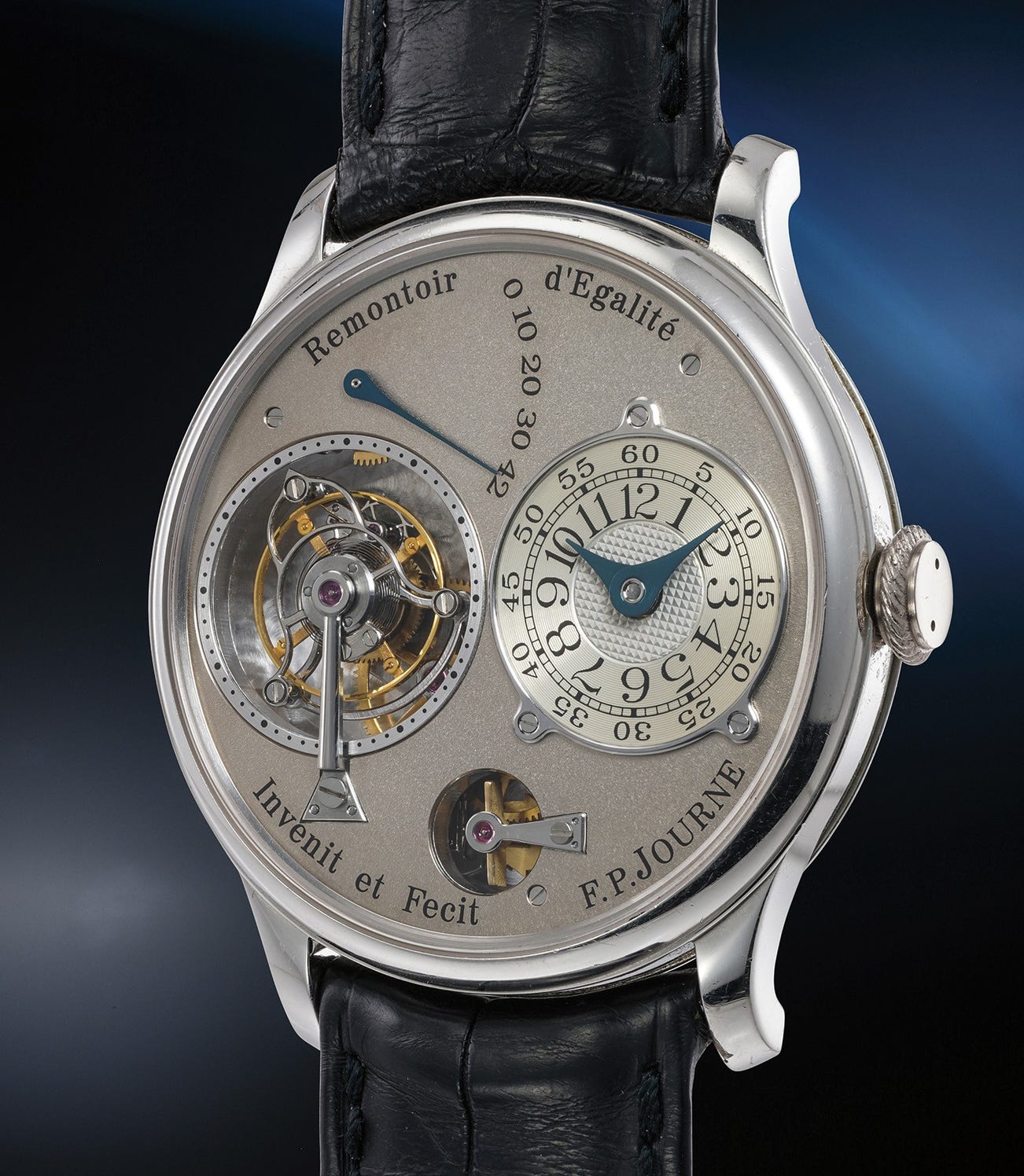 The present Tourbillon à Remontoire d’Egalité is one of the earlier production pieces dating from 2001. The majority of Journe’s Tourbillon models were made with yellow gold dials and the present example is one of the very rare examples made with a white gold dial giving the watch a superbly stealth monochrome look.