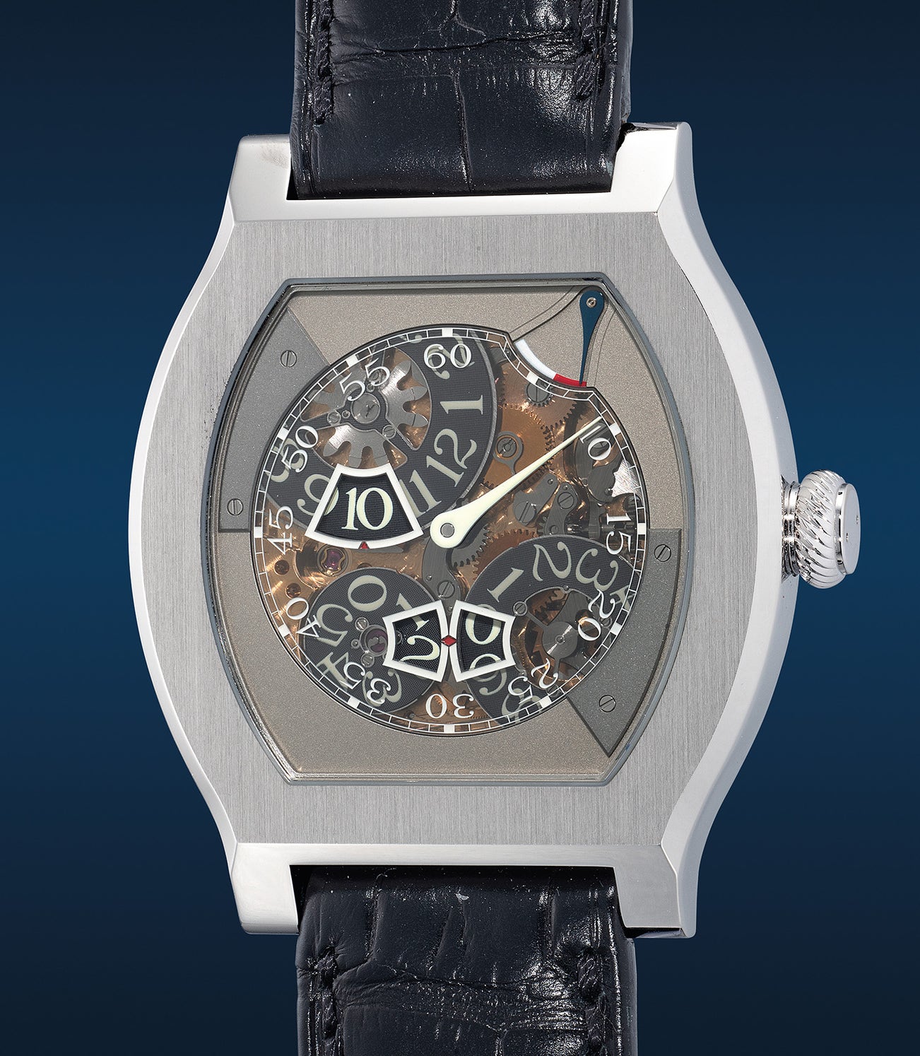 Framed in a traditional tortue shaped case, the Vagabondage III aestheticly modern thanks to its deceptively complex yet elegantly minimal pared-down dial.