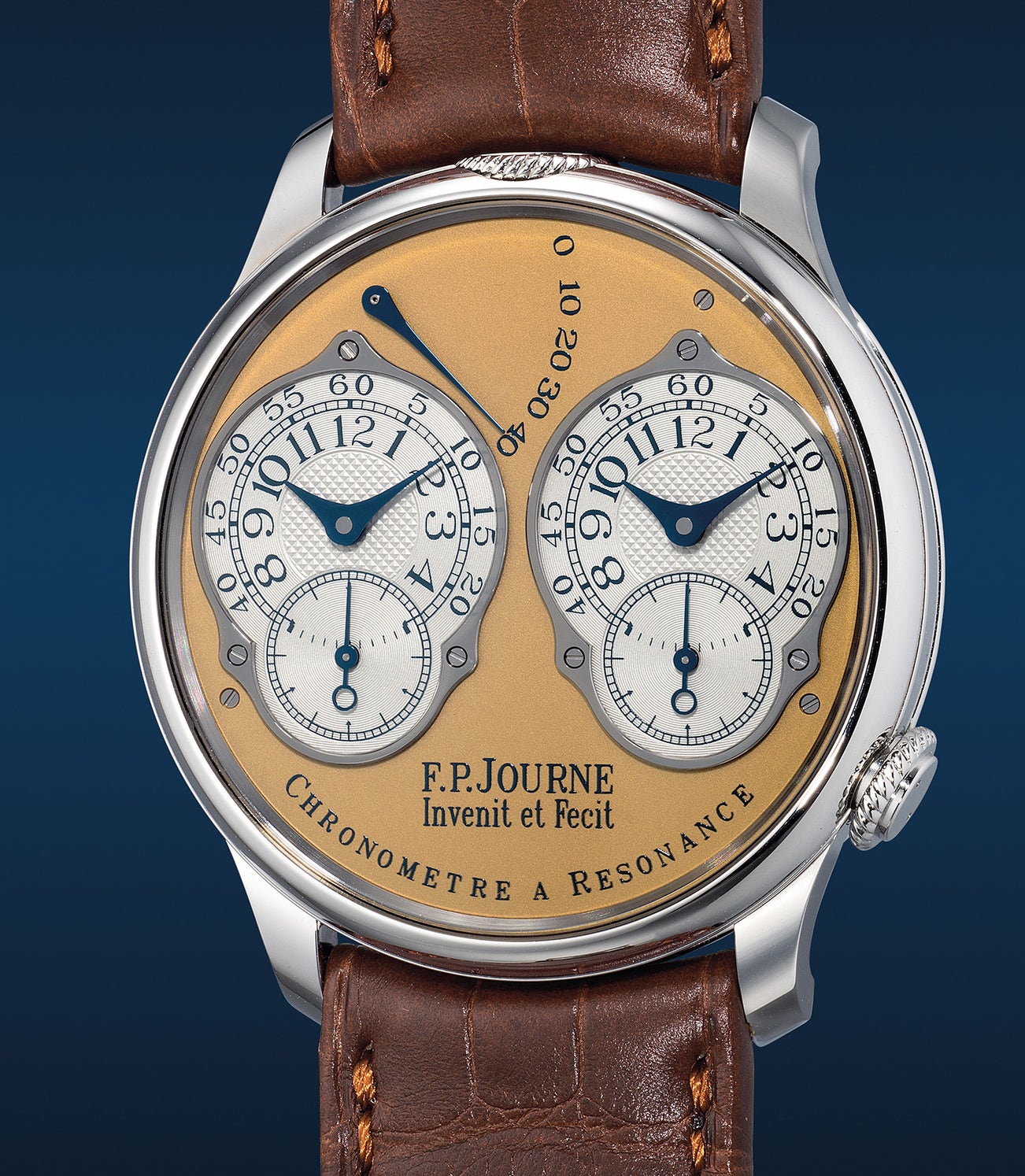 With the dashing good looks of a first generation Résonance, the movement that powers the present timepiece is identical to the pink gold cal. 1499.3 in the present production. This timepiece stands as a horological dream that harnesses a resonance phenomenon to provide unparalleled chronometric performance and an enduring demonstration of F.P. Journe’s mastery of complex high watchmaking.