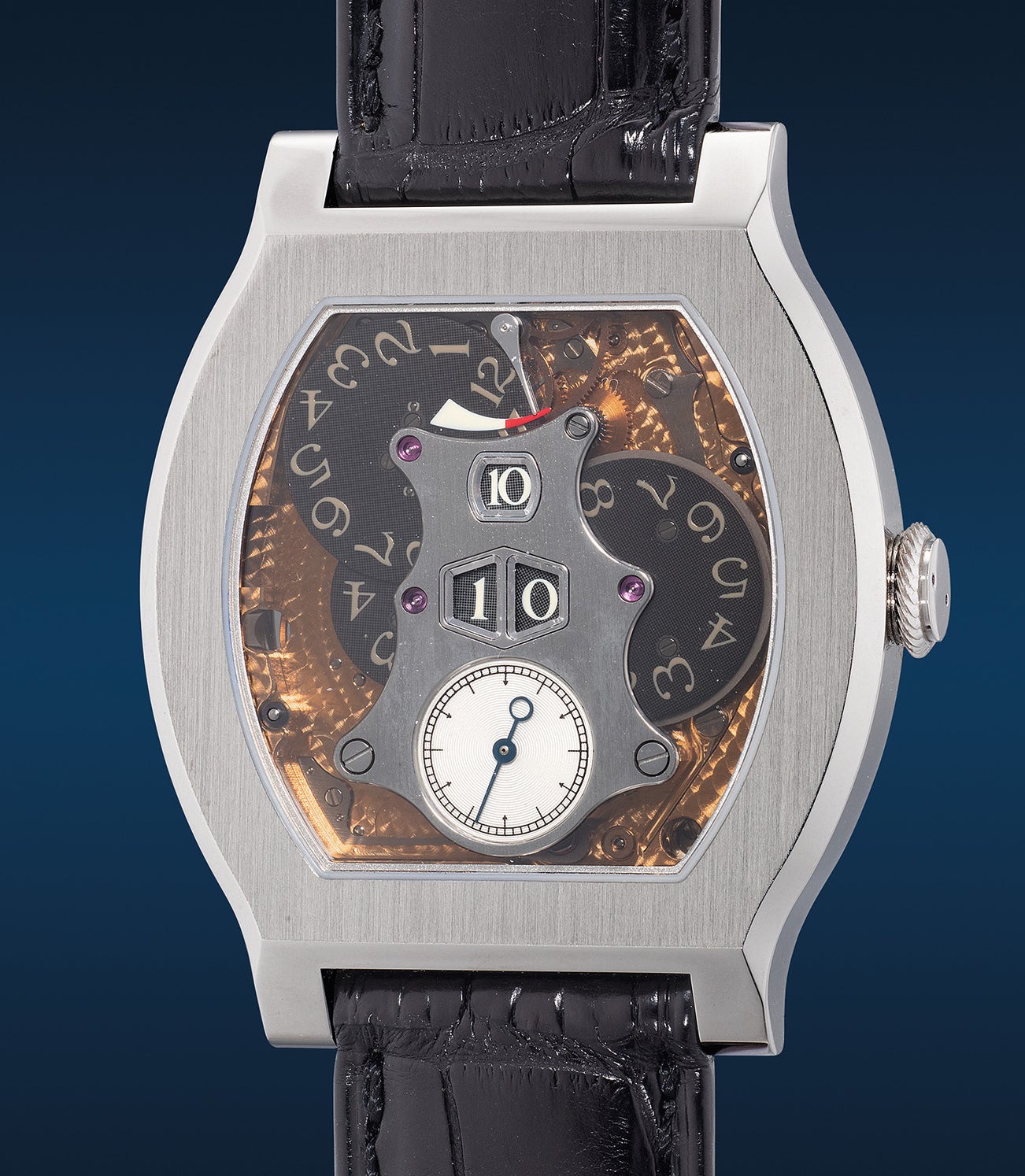 The Vagabondage II is an interesting and innovative timepiece featuring jumping hours and minutes via rotating discs indicated through apertures that are perfectly aligned in the center of the dial along with its small seconds. Interestingly and quite unusually no brand name is mentioned on the dial but a cavalcade of details display the brand’s unmistakable genetic codes. The watch houses the in-house caliber 1509 in pink gold, fitting perfectly into the case, beautifully finished, and features a constant force device that ensures that the energy from the mainspring is equally distributed with no loss each time the discs jump.