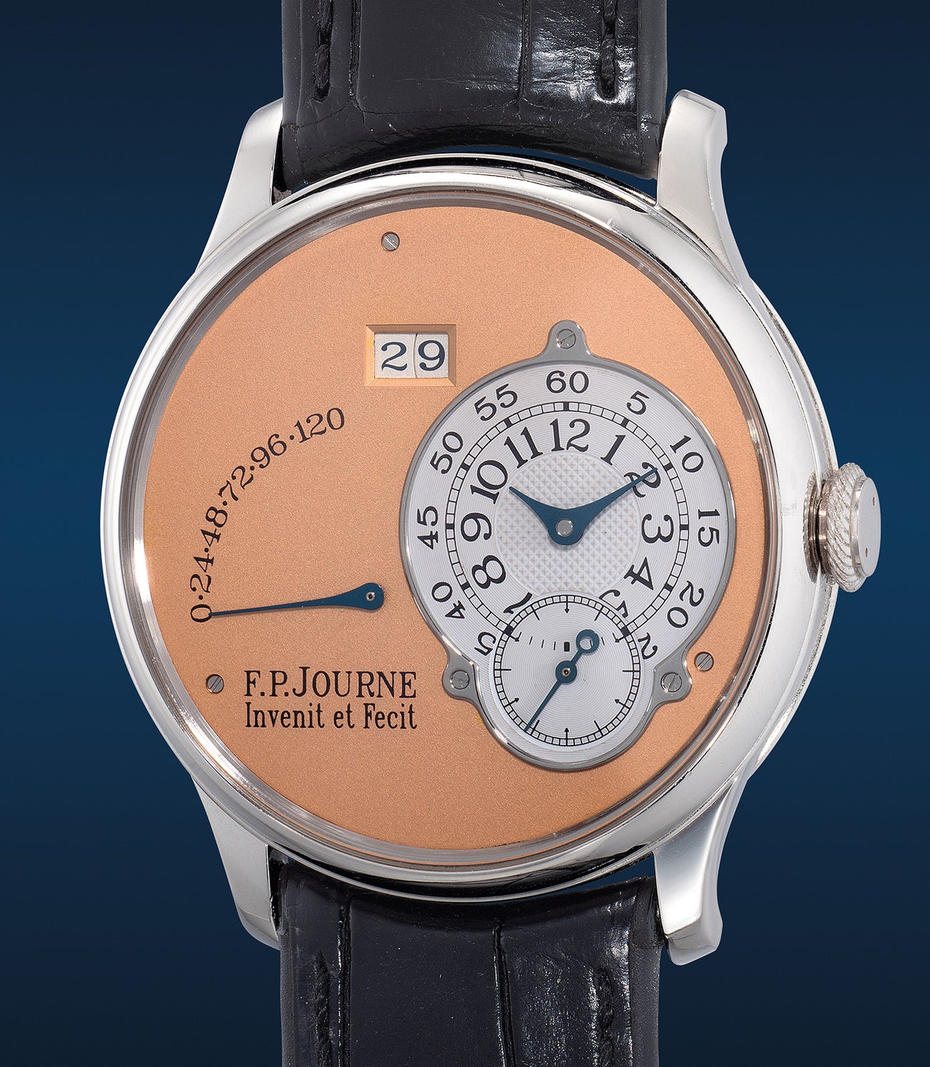 The early dials from its production made of gold has a beautiful grained texture, and often has a propensity to develop patina and oxidation. The present platinum Octa Réserve de Marche on the other hand, is extremely well-preserved with a rare pink gold dial that kept its original glory from the day it left the workbench. Warm pink in color with an almost pale salmon hue in different angles, the timepiece is truly spectacular. Offered by the original owner and ticking all the boxes for collectability, the present brass movement 38mm timepiece from circa 2002 is accompanied with its rare and early three-level wooden box.