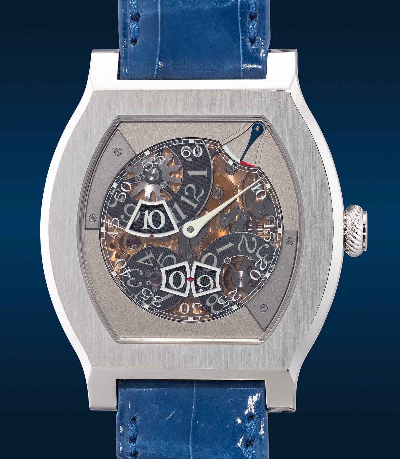 The present example paired with a handsome blue strap is numbered 37 of the 69 pieces made in platinum, is in exceptional condition and is further accompanied by its original accessories and an additional black strap. For the Journe enthusiast looking to complete the trilogy or own a horological marvel, this timepiece will be a fine addition. Seldom does a watch so seamlessly fuse tradition and avant-garde in a harmonious vision of timekeeping as this, one of the most unusual and important wristwatches ever made.