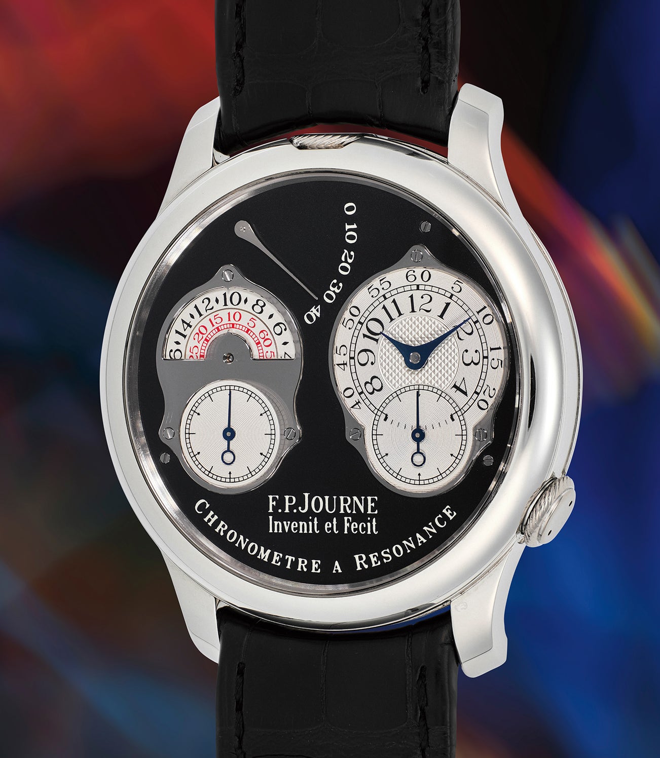 But it is not only that this reference is long discontinued, or that the dial display is striking and unusual. This “RT” is fitted with a coveted “Black Label” dial, an inky and shining black only cased in platinum and only available to previous clients of F.P. Journe through their boutiques. Very few have appeared in public, reflecting how few were made.