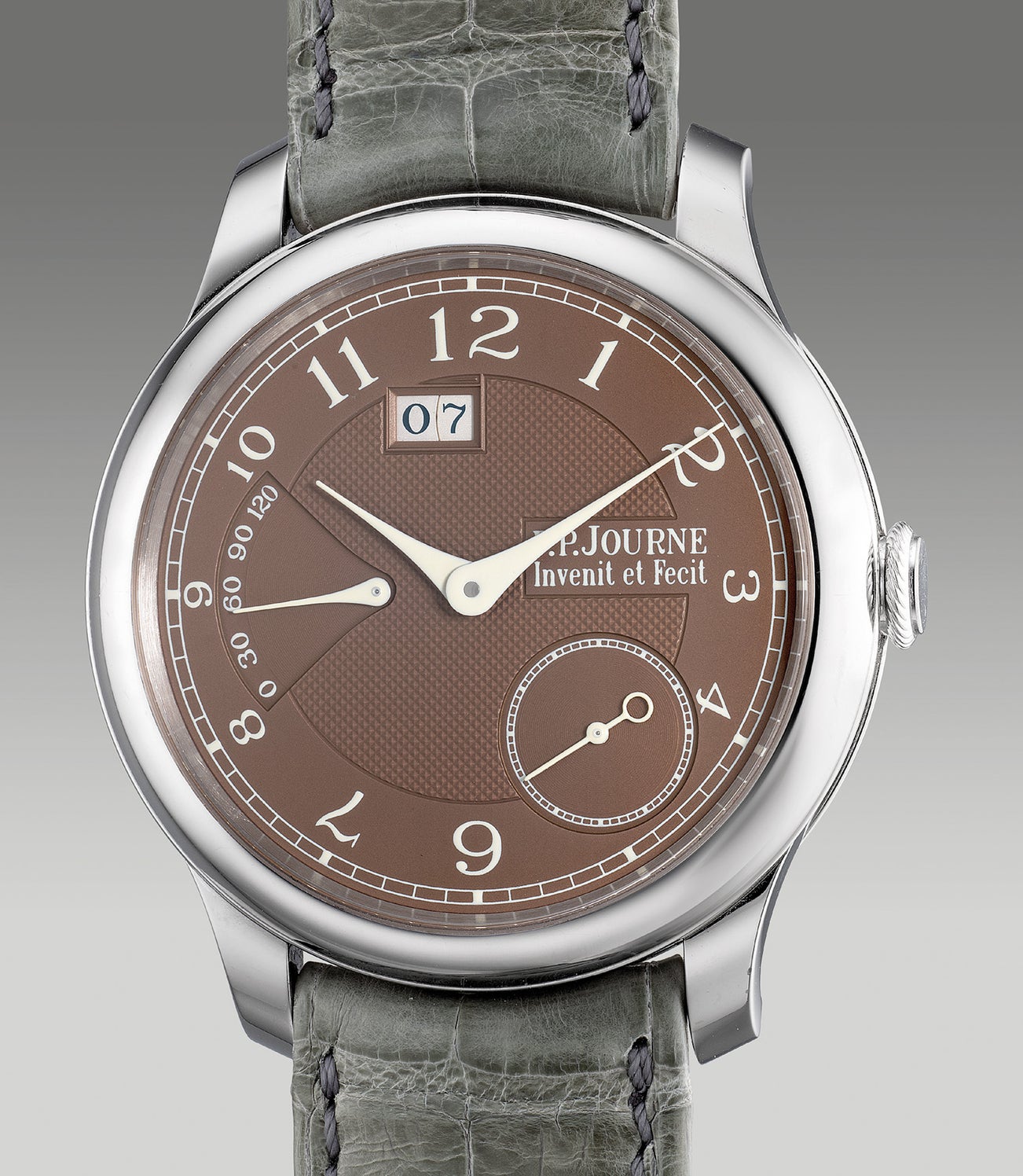 Debuted on the Octa Automatique Lune and the Octa Automatique Réserve like the present example, the warm tobacco brown dial dubbed “Havana” shifts in apparent depth of tones and saturation as the light changes. Developed by Journe’s own dialmaker, Les Cadraniers de Genève, the colour is a combination of gold and ruthenium that underwent rigorous adjustment to perfect the formula. The Octa models both cased in a discreet 40mm diameter platinum case with Clous de Paris hobnail pattern taking centre stage, combined with soft cream coloured hands and numerals that beautifully complements the warm hues of the Cuban brown.