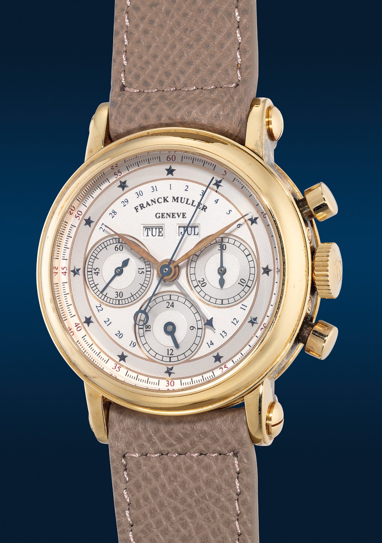 This yellow gold triple calendar chronograph from circa 1999 represents Franck Muller's early embrace of classical proportions, at 36mm diameter. The dial distinguishes itself through stunning blue star-set hour markers, evoking the spirit of the celebrated “Jean-Claude Killy” Rolex Datocompax references made from the 1940s-1960s.