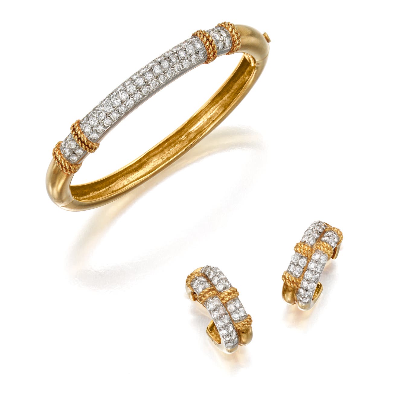 Bracelet set with brilliant-cut diamonds, mounted in 18k yellow gold and platinum, inner circumference approximately 6 inches, signed Fred Paris, with maker's mark and French assay marks, matching pair of earrings set with brilliant-cut diamonds, mounted in 18k yellow gold and platinum, measuring approximately 7/8 inches, signed Fred Paris, with maker's mark and French assay marks.