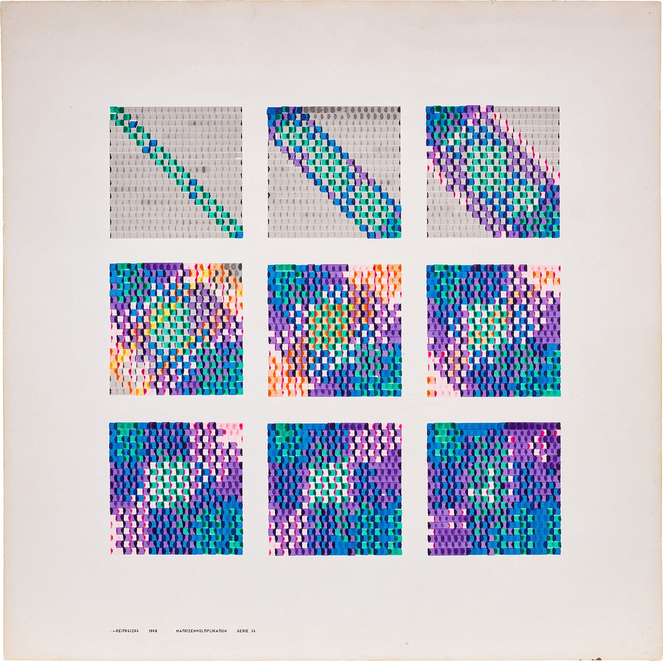 inscribed, dated and titled '-KE/TR4/Z64 1968 MATRIZENMULTIPLIKATION SERIE 34' lower left; signed, titled and dated again 'Nake Matrizenmultiplikation 34 1968' on the reverse