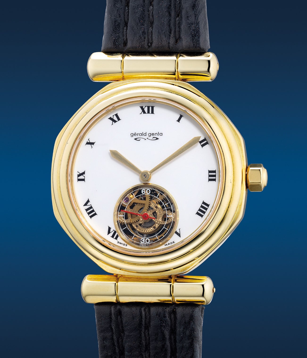 The present Gerald Genta is an elegant iteration of the firm’s tourbillon cased in their iconic octagonal-shaped case is a hidden gem from the 1990s. Dressed in yellow gold, it features cylindrical lugs that gives a classic appeal to the present timepiece. With cylindrical blocks followed through the design of its original strap, the feature makes it instantly recognizable. Paired wonderfully with a white porcelain dial with painted radial Roman numerals, a one-minute tourbillon escapement is proudly displayed at the 6 o’clock position. Once turned, the sapphire display caseback reveals an impressive hand-engraved movement composed on 18K gold and the firm’s signature self-winding rotor. Numbered 55 on its caseband and preserved in attractive overall condition, this present example is one for the many Genta collectors.