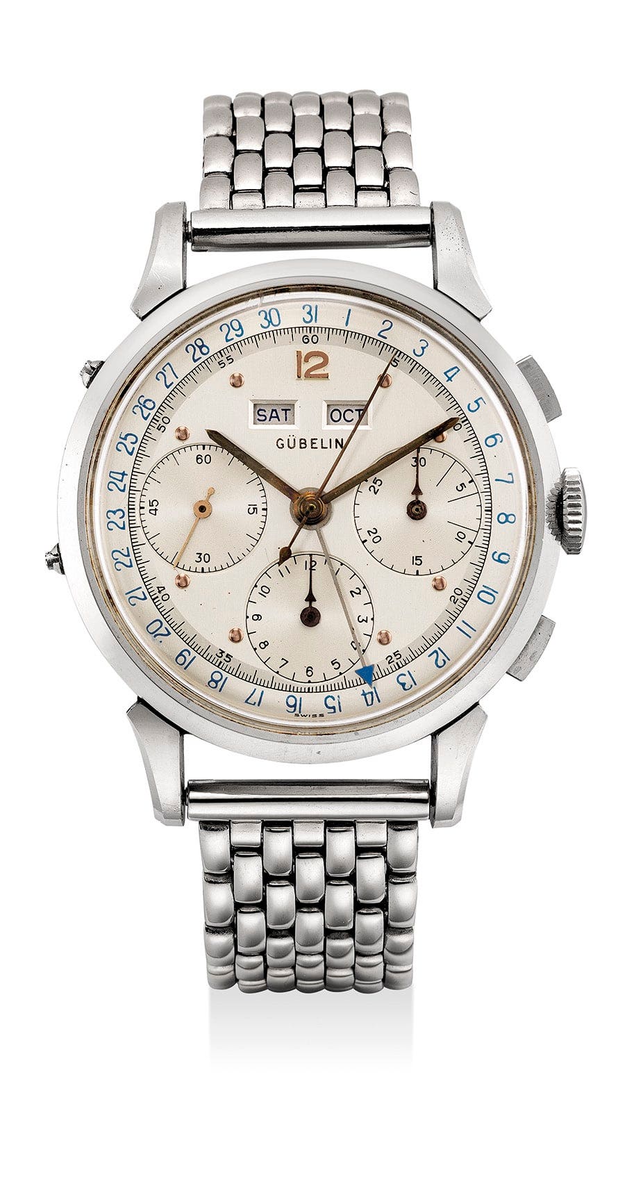 A remarkable example of watchmaking from the mid-twentieth century, the present watch perfectly exemplifies how outstandingly attractive and appealing vintage timepieces can be acquired even at a relatively affordable price range. This wristwatch ticks many of the boxes which usually make the hearts of watch collectors beat faster: it features an astoundingly well preserved stainless steel case with fancy lugs; an equally impressive three tone dial, also in remarkably honest and well-preserved condition; the triple calendar and chronograph set of complications with double window for day and month at 12 o’ clock, and outer date ring; a generous case diameter. Furthermore, this is one of the extremely scarce examples of wristwatches with case, movement and dial all signed by Gubelin. According to the Archives of Gubelin, the present piece was sold in the late 1940s. This piece will without a doubt be a treasured possession for the most exigent and discerning among the vintage watch collectors.