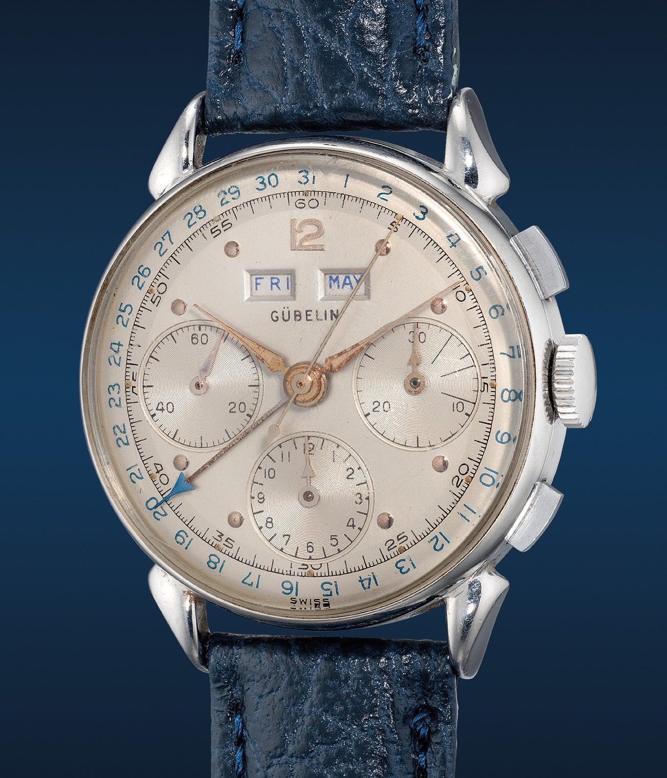From the fancy cow-horn lugs to the distinct typography, the present Gubelin signed timepiece perfectly encapsulates the essence of the 40s. Well-preserved, the lightly patinated dial features a triple calendar chronograph function that displays the day and month apertures above its signature, with an additional central hand that indicates the date around an outer track.
