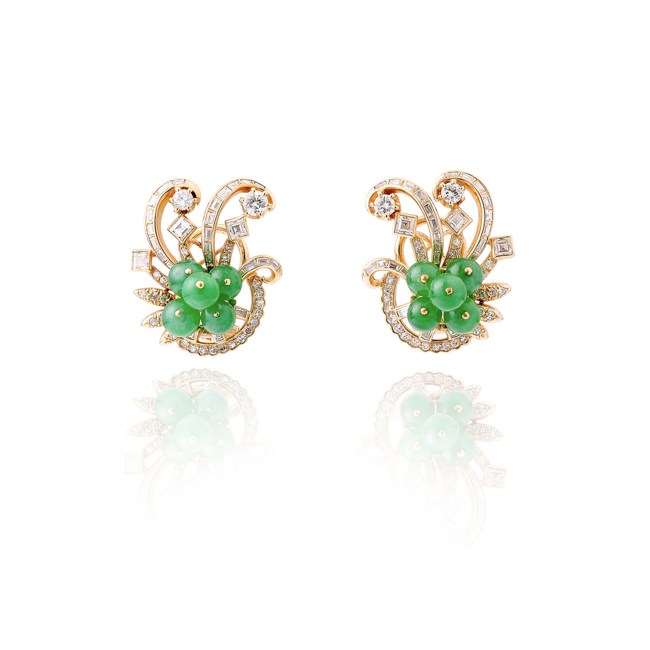 Each set with five green chalcedony beads, highlighted with circular-, single-, step-cut and baguette diamonds, measuring approximately 27 x 22mm, each with maker's mark for Gübelin.