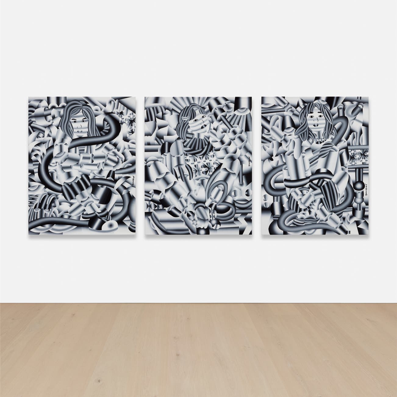 each signed "BOUILLOT" lower right vertical edge; each signed, respectively titled, inscribed and dated "["Portrait de Orphné; Portrait de Calypso.; Portrait de Thétis"] Geoffrey Bouillot. TOKYO 2022!" on the reverse
