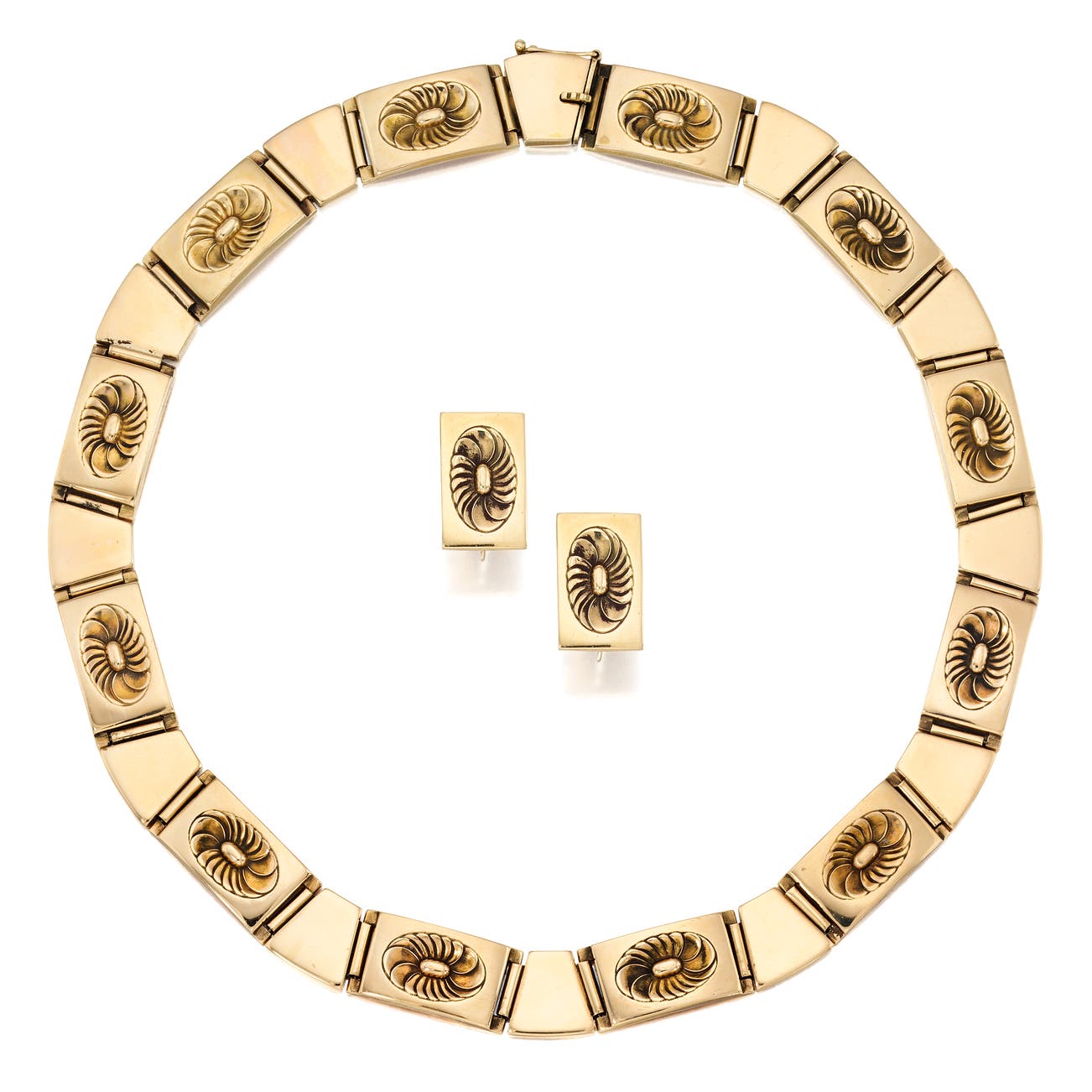 Comprising: a necklace, inner circumference approximately 15 inches, and a pair of earrings, measuring approximately 3/4 x 1/2 inches, each mounted in 14k yellow gold, signed Georg Jensen, each with model no. 56.
