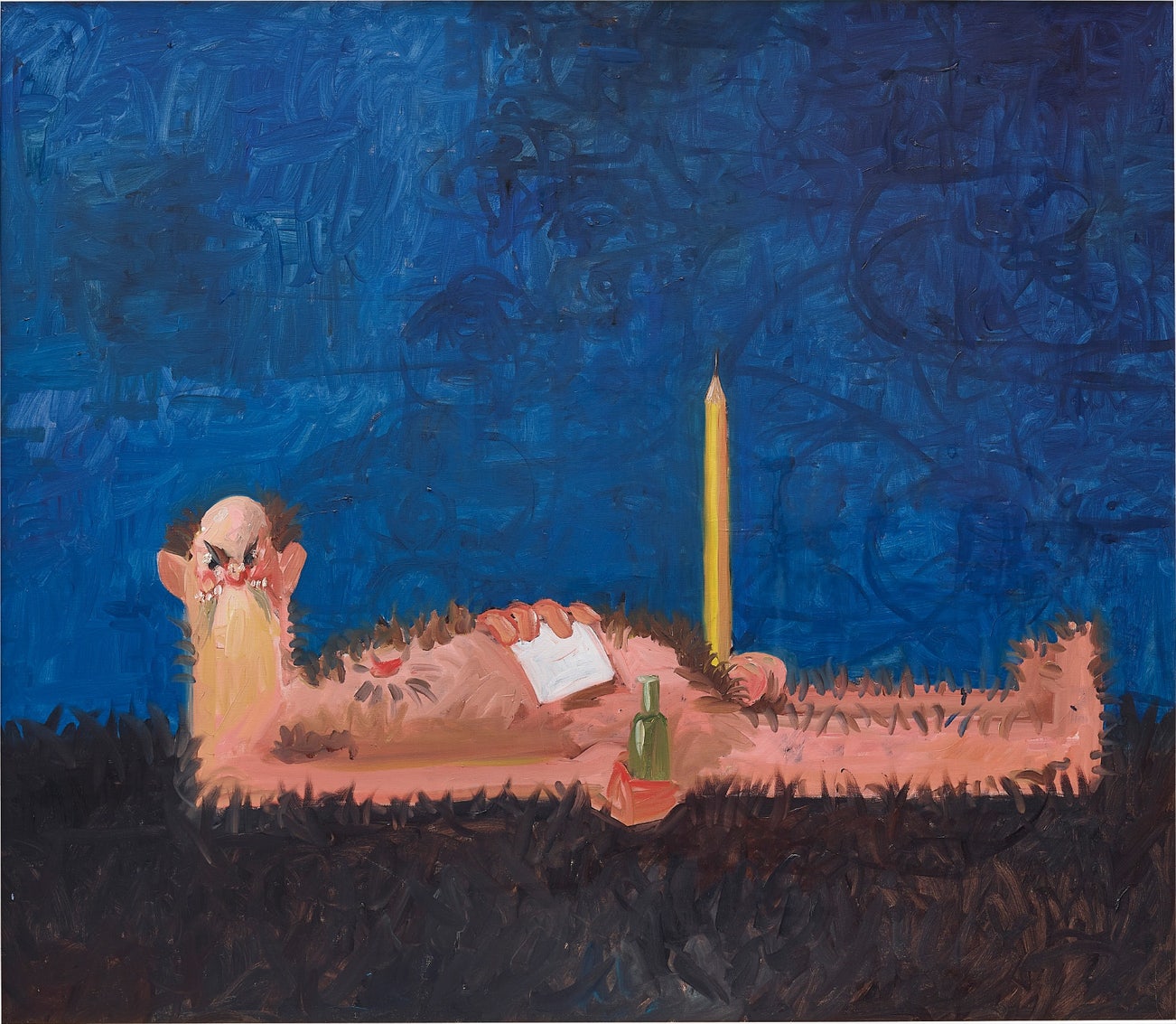 康多的肖像創作也同時令人緬想起文藝復興時期歐洲北方所風行充滿寓意的肖像畫,當時肖像的主角往往是為了表現某個特定角色或是一種美德。康多畫中的角色千變萬化,他曾畫過聖母、小丑、卡通人物以及花花公子的兔女郎,在這件作品中,藝術家在此將作家這個職業轉化成二十一世紀的一個現代寓言。首先,他一反肖像畫直立的格式,轉而採用一般畫風景橫式的構圖,再將主角拉長的裸體橫跨切分著畫中的地平線,主宰著畫面。而一支超大的鉛筆,像是個誇飾加大版的男性性器官一般,直聳聳又粗野地垂直豎立在畫面中央。正如典型的寓言,康多筆下的作家,乘載了雙重意義:主角手裡緊握著的瓶子,裝的可能是墨水或是酒,而筆直的書寫工具則是象徵了主角的大膽創造力。畫中情慾高張及主角大膽直視的目光,不禁讓人聯想起堤香的《烏比諾的維納斯》和馬奈的《奧林琵雅》。然而,主角身上雜亂的頭髮及體毛,幾乎要與草地融為一體,康多滑稽地將他塑造成一個孤獨、自我中心、醉醺醺、自信、對世界充滿敵意,卻又充滿了存在焦慮的角色。