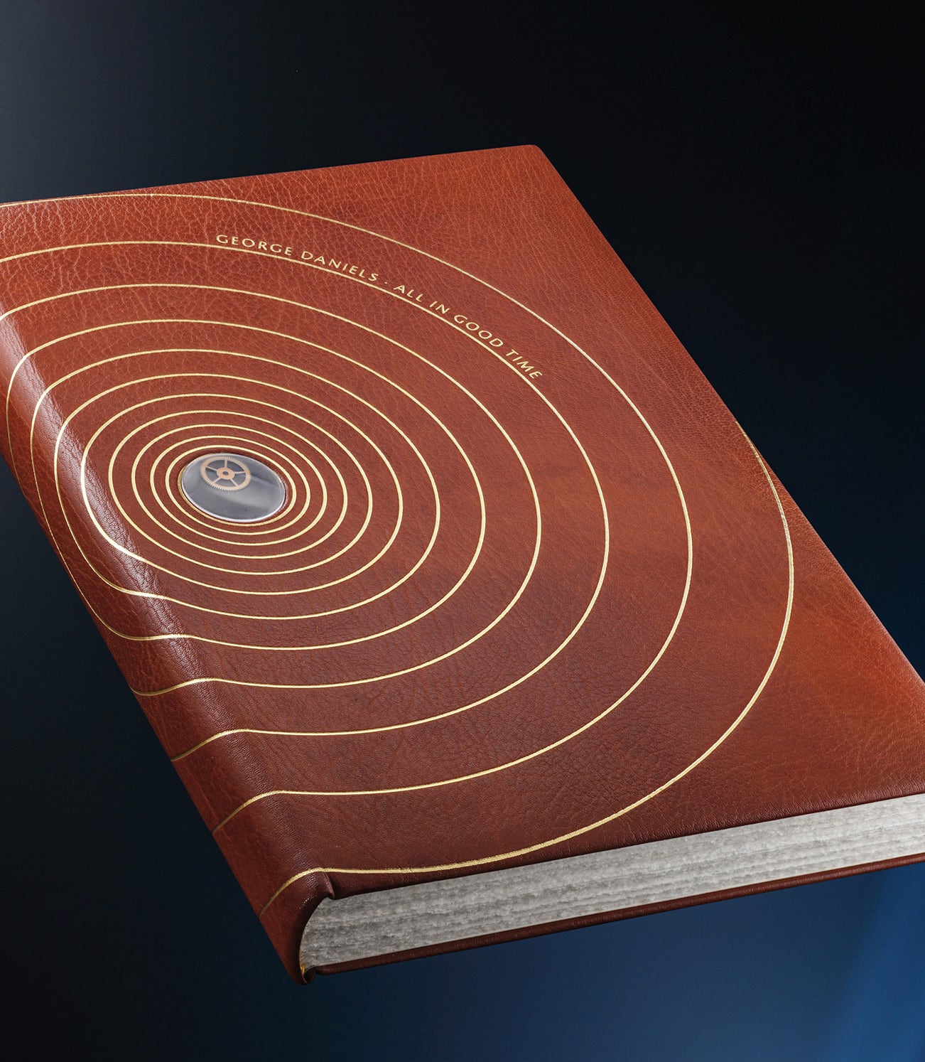 The present book is a luxurious leather bound limited edition book of George Daniels' autobiography "All in Good Time". The cover is in leather, with gold tooling and a recessed panel covered by a glass containing a watch component made by George Daniels.