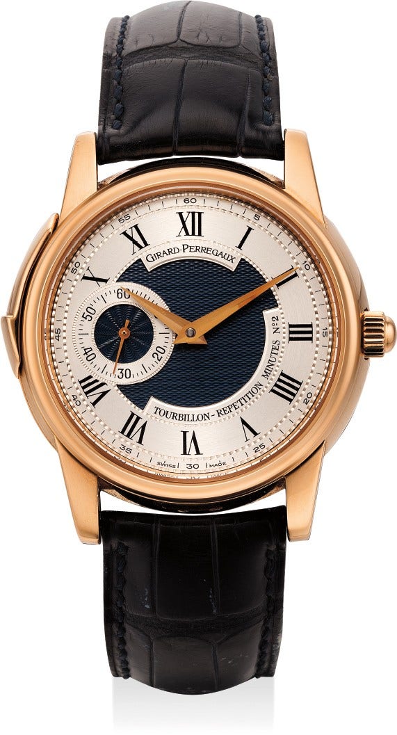 Today, the brand has created many different variations, and the present watch is from the late 1990’s, featuring a tourbillon and minute repeating mechanism. The blue-grey guilloché with polished chapter ring with Roman numerals has a cool aesthetic and when one turns the watch over the sapphire crystal back reveals the heart of the watch, with three beautifully engraved gold bridges, and underneath one sights the one minute tourbillon cage. The repeat mechanism has a clear tone and quality and one can see the two hammers striking the gongs, one mark “H” for hour, the other “M” for minutes.