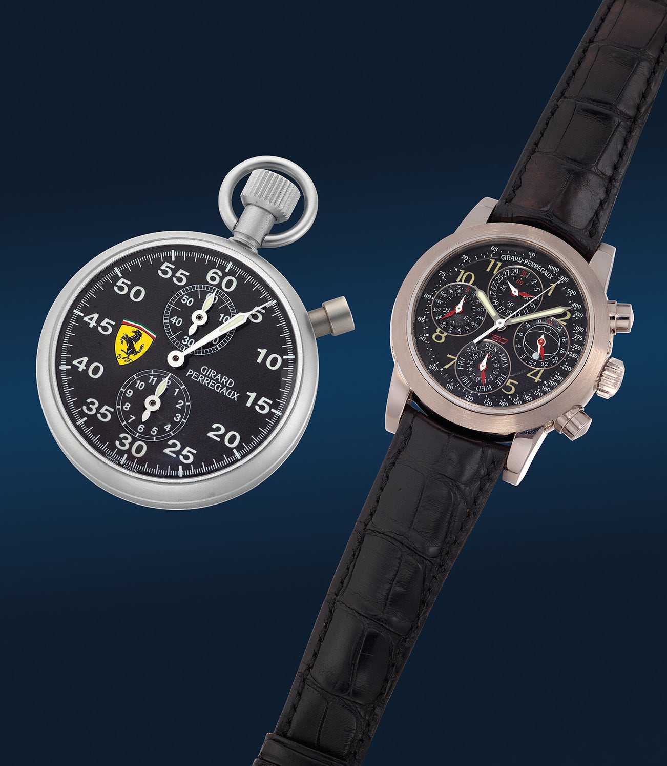 Also included in this lot is the Sport Timer pour Ferrari Limited Edition Stopwatch, the ultimate trackside complement for Ferrari devotees launched by Girard-Perregaux in 2000 to celebrate an enduring alliance with motoring's most hallowed name.