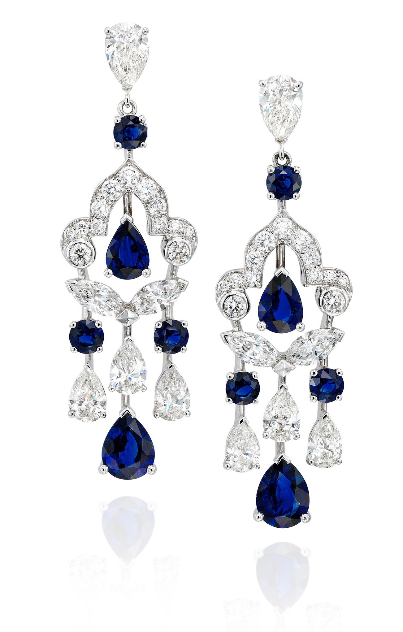Each set with a pear-shaped diamond weighing 0.71 carat and 0.70 carat respectively, supporting brilliant-cut, pear- and marquise-shaped diamonds, accented by circular-cut and pear-shaped sapphires, mounted in white gold, posts and hinged back fittings, each signed Graff, numbered, stamped.
