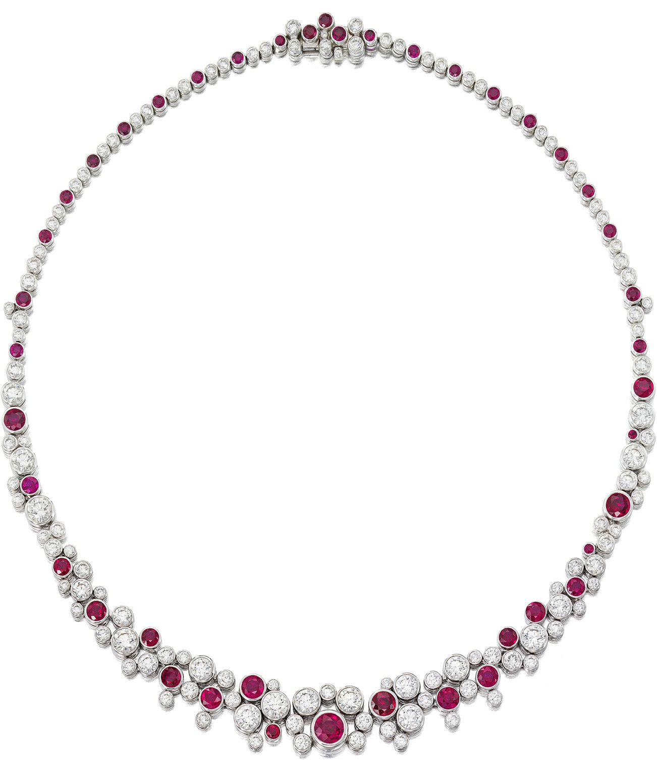 Of graduated cluster design, bezel-set with brilliant-cut diamonds, accented with bezel-set circular-cut rubies, mounted in 18K white gold, length 16 5/8 inches, signed Graff, numbered, pouch signed Graff.