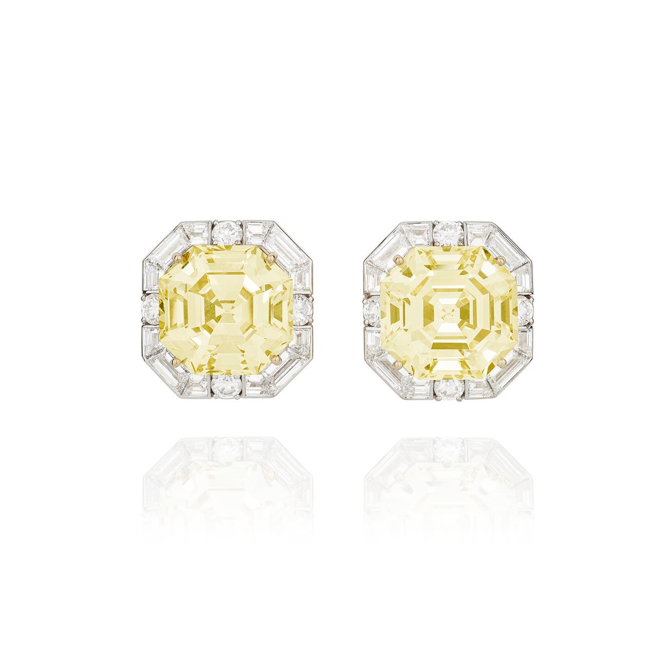Each set with an octagonal step-cut fancy yellow diamond weighing 20.33 and 21.38 carats respectively, within a surround of baguette and brilliant-cut diamonds, each signed Graff, numbered, British hallmarks for gold.