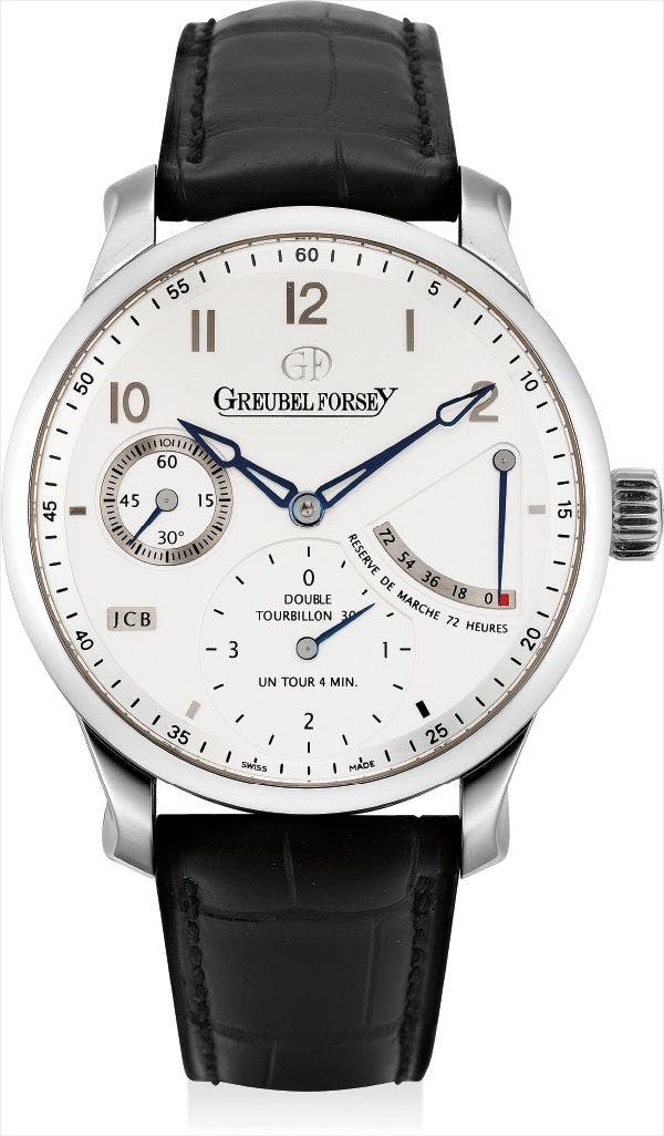 Offered in like new condition, the present watch is known as 'The Secret' as the double tourbillon 30° is hidden behind the dial. This mysterious and discrete design was first introduced by Greubel Forsey in 2008 and is further enhanced with a power reserve feature.