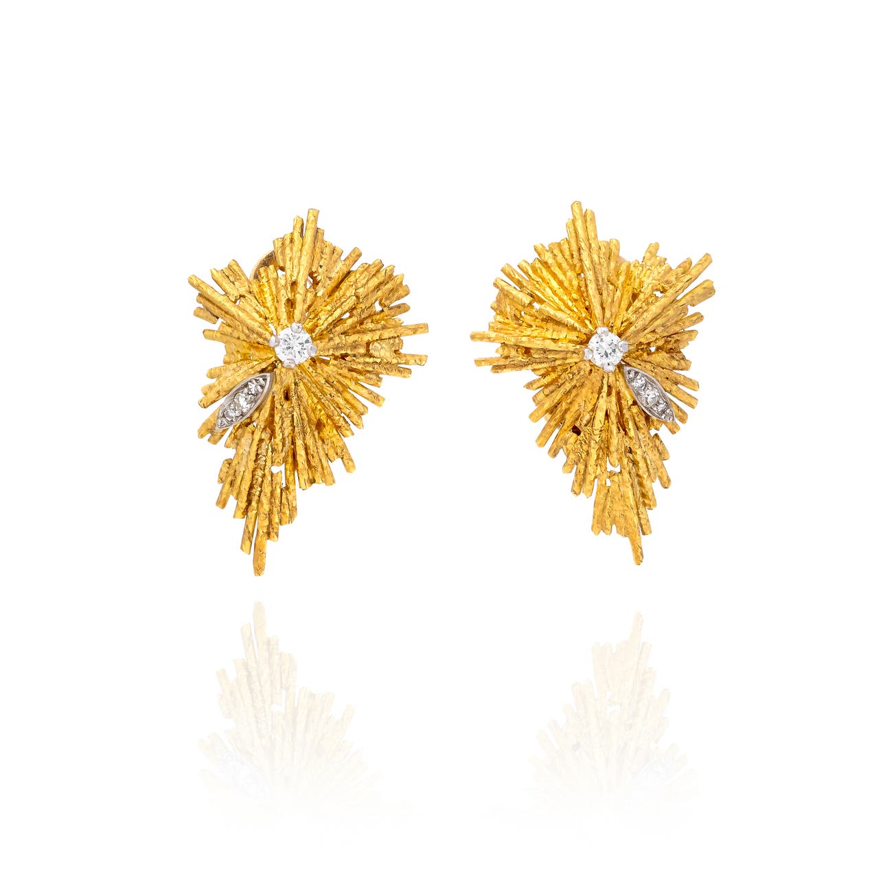 Of textured wire design, each set with a brilliant-cut diamond, accented with single-cut diamonds, each measuring approximately 27x20mm, signed Grima for Andrew Grima, British maker's marks and hallmarks for gold, post and hinged back fittings.