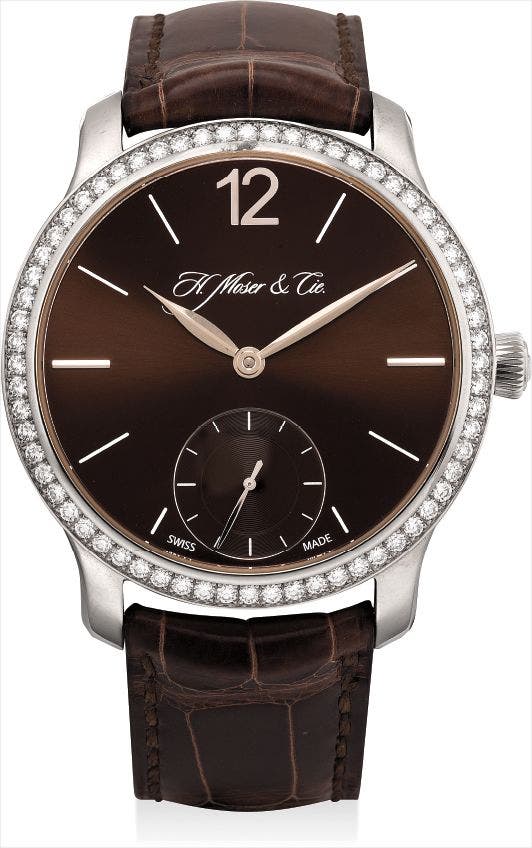 H. Moser & Cie. takes its inspiration from pocket watches. The Endeavour Small Seconds is a very popular watch and the present example is further distinguished with its diamond-set bezel and rare brown dial that is ever changing its appearance in different shades of lights.