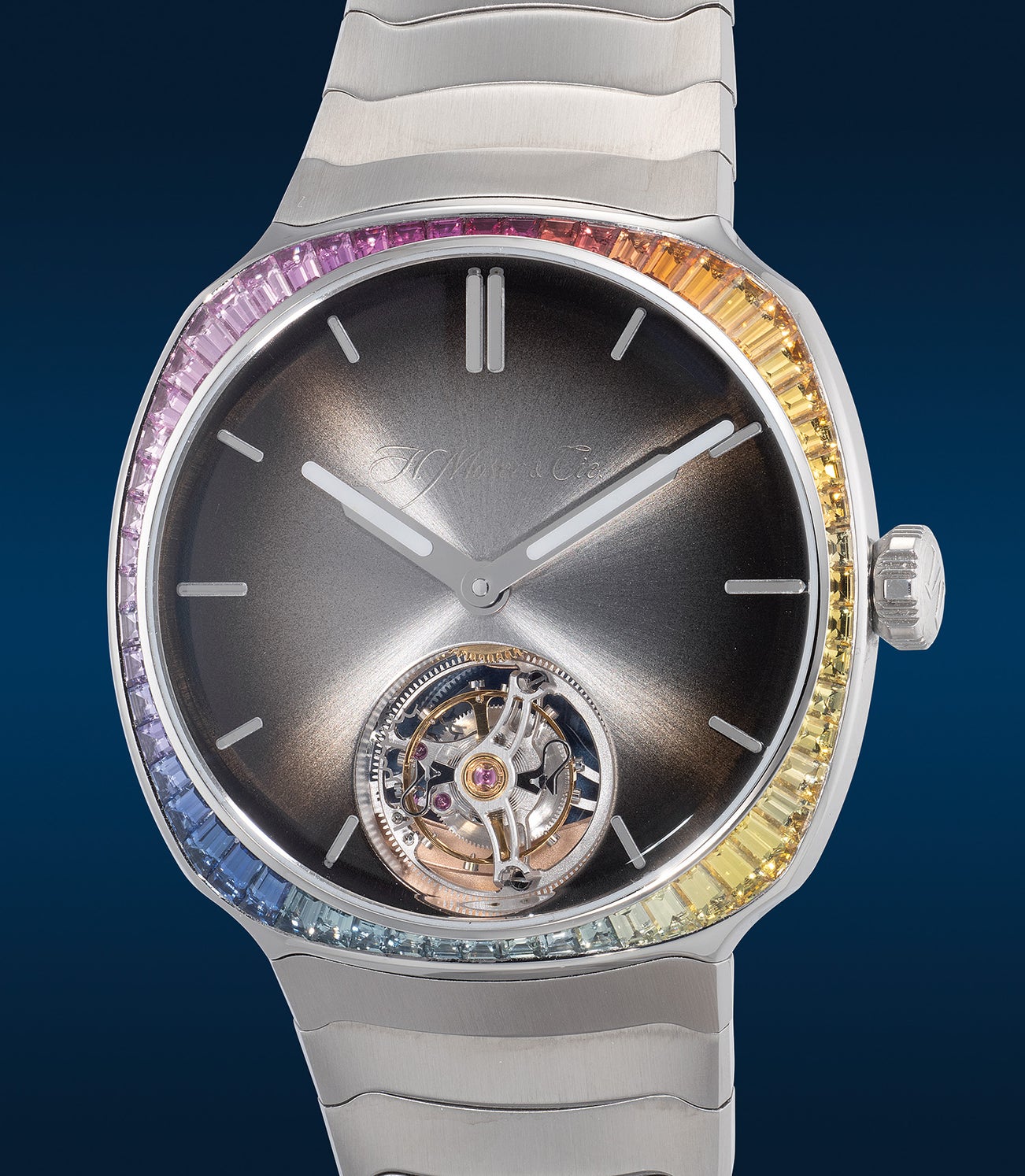 亨利慕時,「Streamliner Tourbillon Rainbow」型號6804-1201,精細,精鋼自動鏈帶飛行陀飛輪腕錶,備多彩寶石錶圈、灰色煙燻錶盤,約2023年製。附錶盒、原裝證書