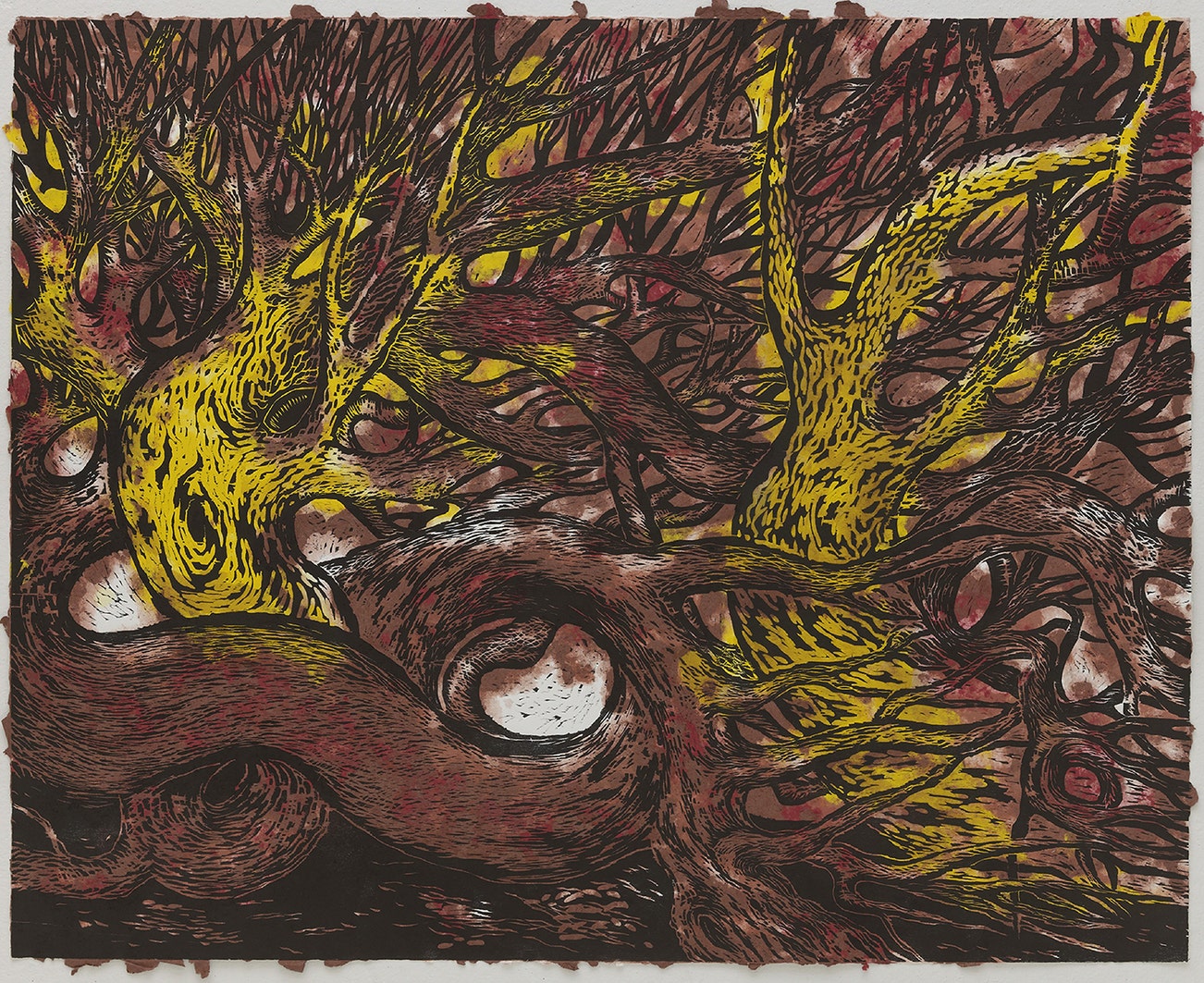 This artwork was created during a collaboration with the workshop team at the Singapore Tyler Print Institute in 2013. Exchanging her signature stone and marble medium for softer and more flexible paper pulp, Han Sai Por aimed to explore the motif of the forest, a theme which has occurred throughout her artistic practice. She often makes references to deforestation, destruction and extinction in her work, drawing on her experience of Singapore’s shifting landscape from rainforest island to urban land mass over the course of her lifetime. In Nestles 5, Han presents a primal forest under threat from extinction, yet it is not depicted as defeated or mournful, but as a place that still seems to pulsate with life.