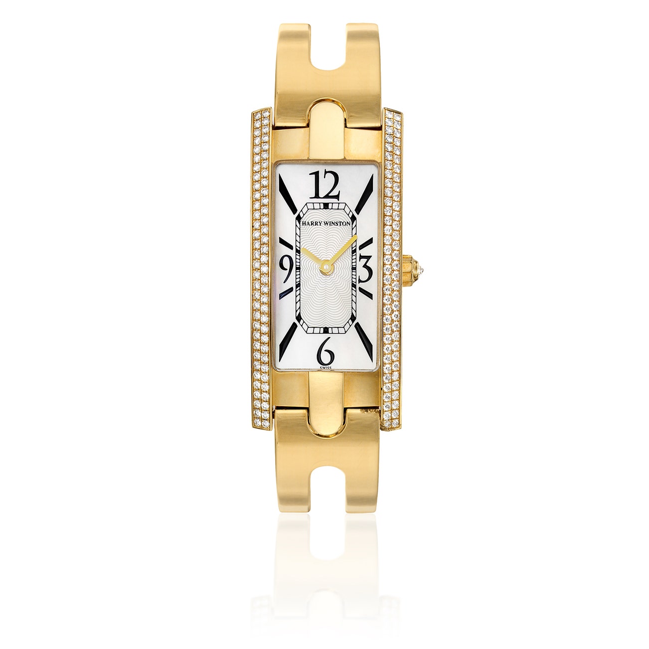 The mother-of-pearl dial applied with Arabic numerals, the bezel accented with brilliant-cut diamonds, and a diamond-set crown, mounted in 18k gold, quartz movement, inner circumference approximately 5 1/8 to 6 1/4 inches, dial, case back and bracelet signed Harry Winston, case back numbered, case stamped Harry Winston.
