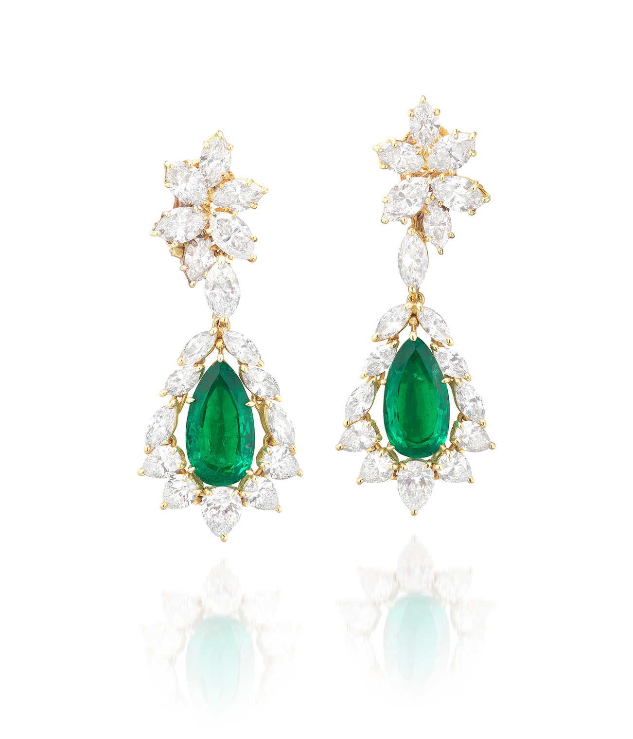 「哥倫比亞」天然祖母綠配鑽石吊耳環一對, 祖母綠共重約10.05克拉, 海瑞溫斯頓
